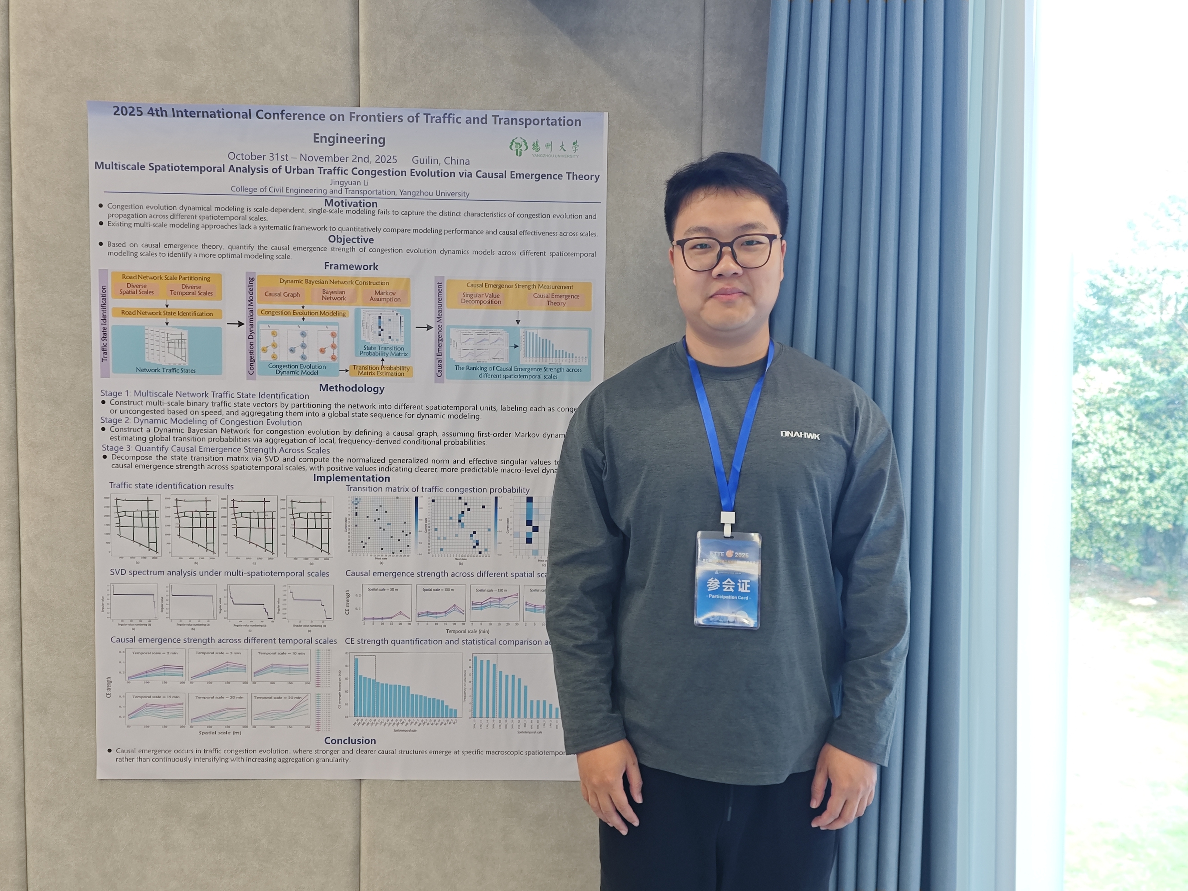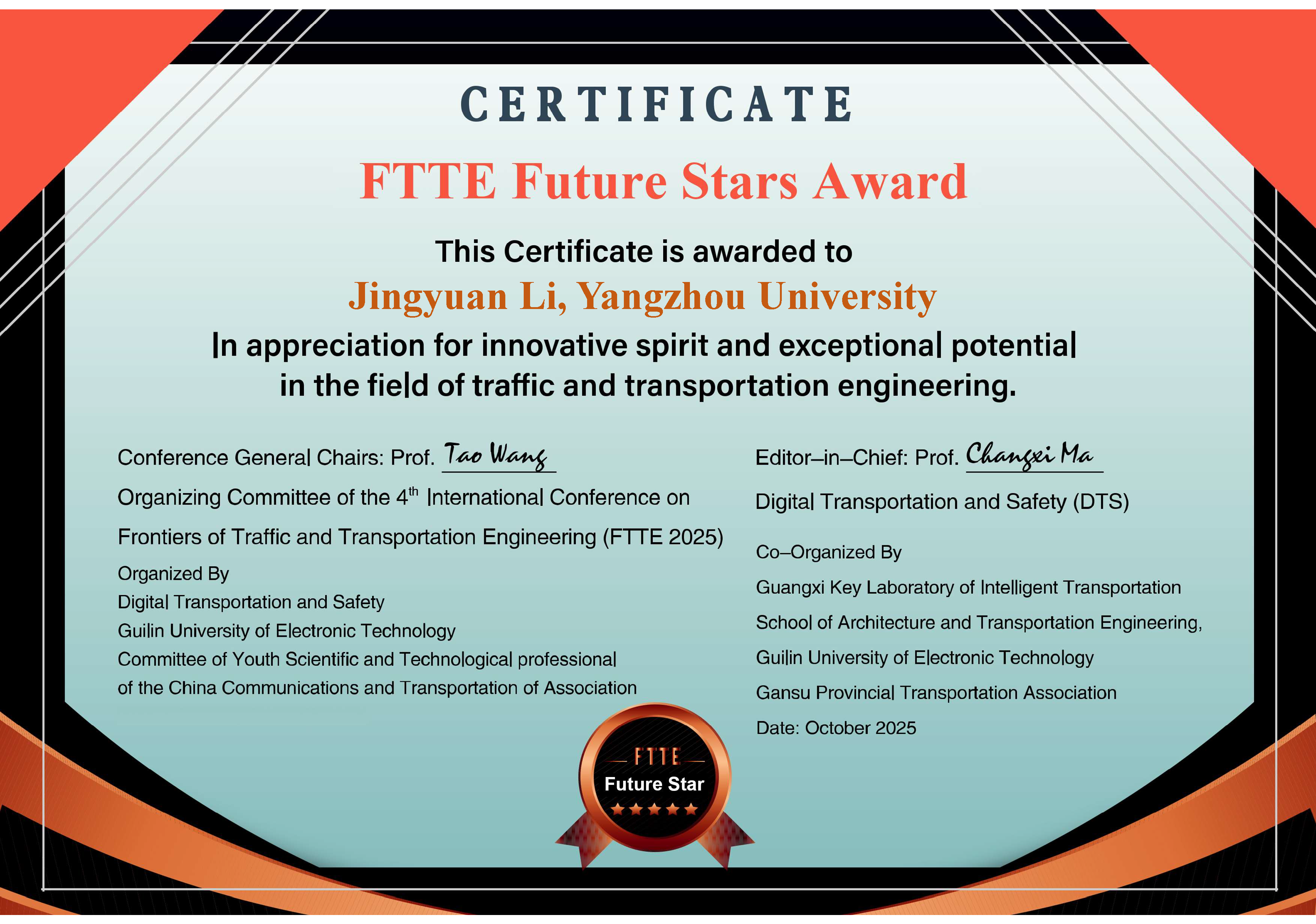 On October 25th, at the 4th International Academic Conference on Frontier Transportation Engineering (FTTE 2025), the international journal Digital Transportation and Safety, jointly with the conference organizing committee, officially announced the selected list for the 2025 "Future Star in Transportation Frontiers" Cultivation Program. Our college's master's student Li Jingyuan was successfully selected, becoming one of the 100 global awardees for the year and the only student from Yangzhou University to receive this honor.