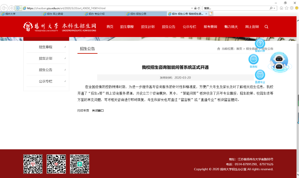 扬州大学招生咨询智能问答系统正式开通:https://zhaoban.yzu.edu.cn/art/2020/3/20/art_40650_745814.html