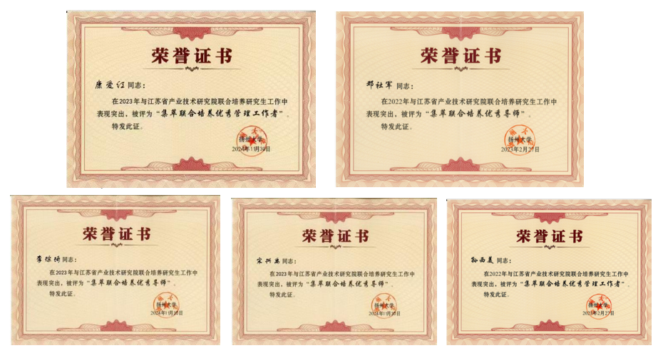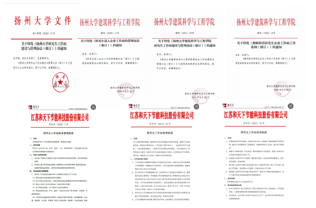 扬州大学积极推动教育、科技、人才协同发展,持续深化研究生人才培养机制创新。结合国家重大战略和行业发展需求,学校规划实施了研究生工作站“拾级而上”的建设体系,形成了“院实践基地-校研究生工作站-省研究生工作站-省优秀研究生工作站-省卓越研究生工作站”的“金字塔型”发展格局。2015年与江苏和天下节能科技股份有限公司共建学院实践基地,2017年获批“江苏省研究生工作站”,2021年获批“江苏省优秀研究生工作站”,2024年获批“江苏省卓越研究生工作站”。