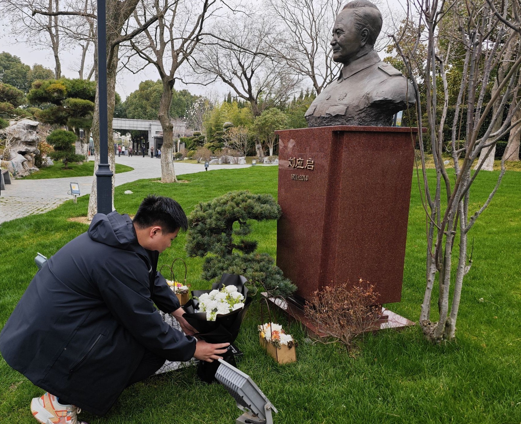 同学们在刘应启纪念雕塑前驻足,寻味老红军刘应启的人生故事。工管2301班班长周文杰代表“刘应启班”同学献上菊花。