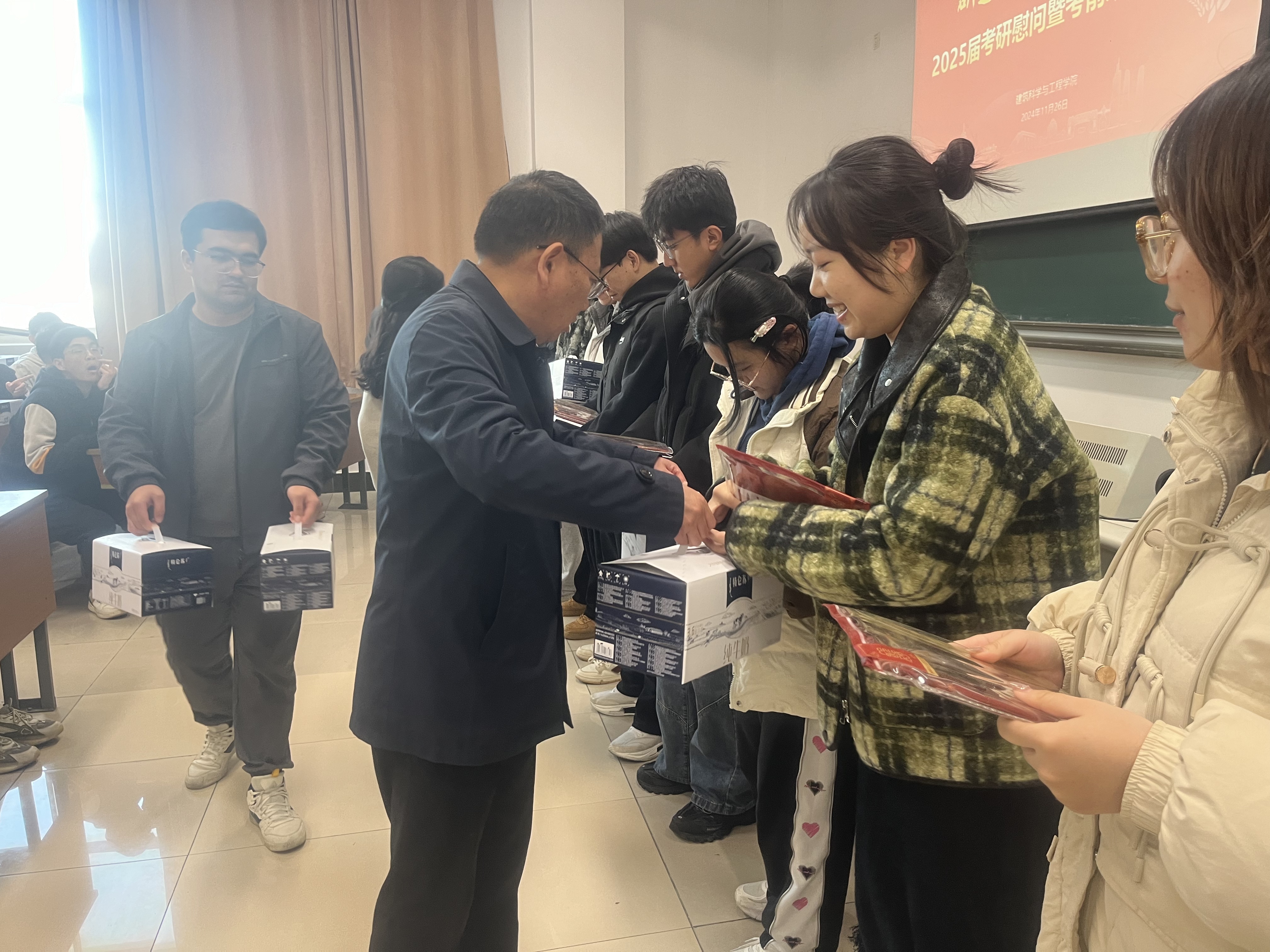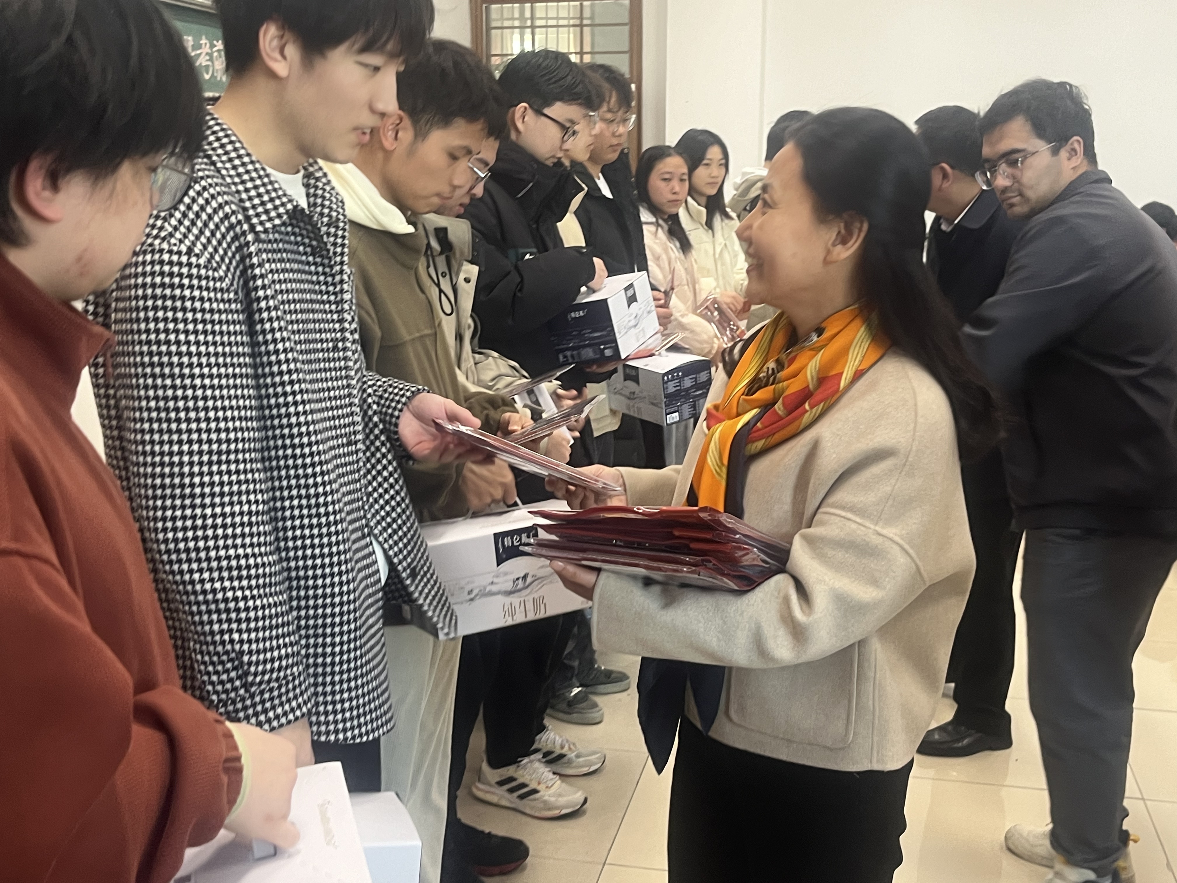 伴随着温馨的音乐,院党委书记王恩军、院长康爱红为考研学子们发放了暖心“福袋”,每一个“福袋”里不仅有实用的学习用品,还有饱含浓浓温情的香醇牛奶,它们如同一道道温暖的阳光,驱散了紧张与焦虑,为每位考研学子注入了自信与勇气。