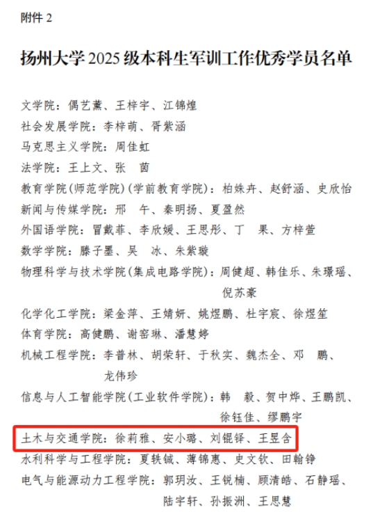 扬州大学2025级本科生军训完美落幕,在军训成果考核评比中,我院凭借新生们出色的训练表现、严谨的纪律作风及全院上下的协同配合,最终荣获扬州大学2025级本科生军训优秀组织单位,“影像展示”优胜单位的称号,徐莉雅、安小璐、刘锟铎、王昱含荣获生军训工作“优秀学员”称号,充分展现了我院学子昂扬向上的精神风貌与优良的集体凝聚力。