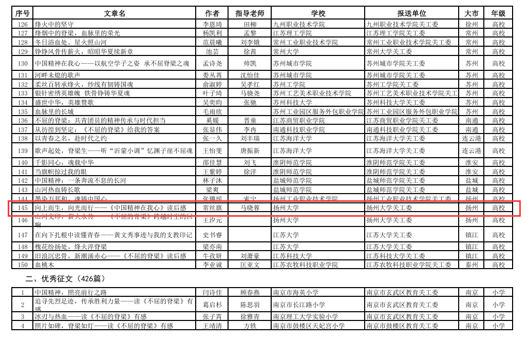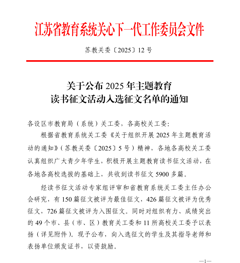 根据江苏省教育系统关心下一代工作委员会近日下发的《关于公布2025年主题教育读书征文活动入选征文名单的通知》(苏教关委〔2025〕12号),我院在本届主题教育读书征文活动中表现优异,喜获佳绩,其中一篇优秀作品成功入选最佳征文。
