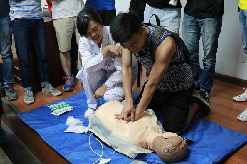 之后,张医师开展了手把手的徒手心肺复苏培训,通过对假人的“急救”逐一指出了徒手心肺复苏的要点。同时,她还鼓励同学们上台练习,并耐心的指出同学操作不到位的地方。