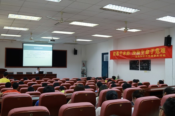 培训现场,张医师阐述了国内外急救技能普及的现状,并通过几个案例指明急救技能的重要性。接着,她结合PPT讲解了急救的几个要点,呼吁同学们遇事不要慌张,要沉着冷静展开施救。张医师的讲解形象生动,同学们都听的很认真。