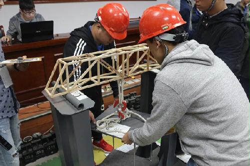 整个比赛分为三个阶段。第一阶段,参赛队员接受了桁架制作培训。之后,队员们到制作室按照图纸要求制作空间桁架,制作现场,同学们或切割木条,或打磨接口,或仔细调胶,每一环节都认真对待。10月15日,大赛进入最后阶段,参赛队员们于S1-102报告厅正式进行桁架加载比赛。比赛现场,同学们制作的桁架有的还未加载便发生断裂,有的则可以承受很重的砝码,制作的精细与用心都在此刻体现。
