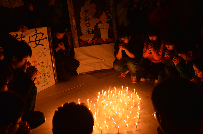 4月22日晚8点,在学院三会办公室里,许多同学正围拢在数十盏烛光组成的心形图案周围,一起为雅安地震灾区的同胞祈福,为雅安地震中的死难者默哀,“雅安挺住,四川加油!”。