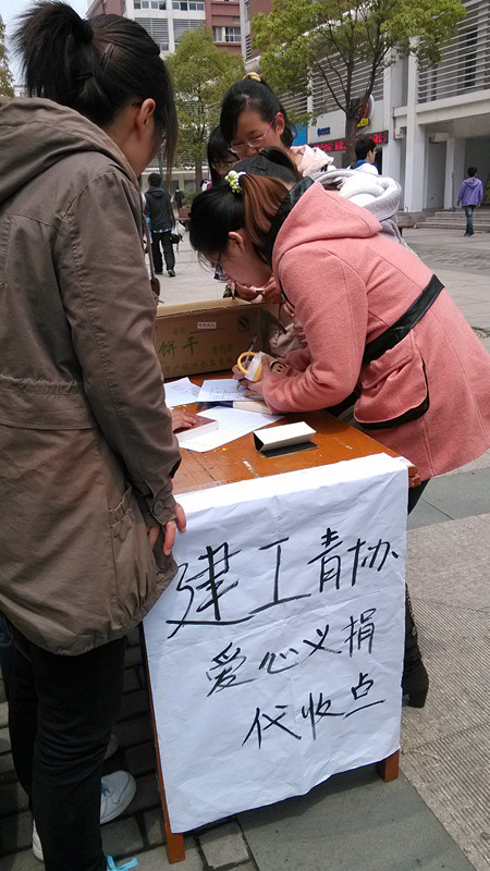 “同学们,捐出你们的一件衣服,一双鞋子,一本书,让青海的贫困儿童感受一次温暖吧。”为了弘扬爱心奉献精神,倡导更多同学参与公益慈善事业,体现当代大学生风采,同时也为缓解西部贫困儿童生活困难,5月3日中午,由建工学院团委主办、青年志愿者协会承办的“牵手青海 爱心义捐”活动在扬子津西校区展开。