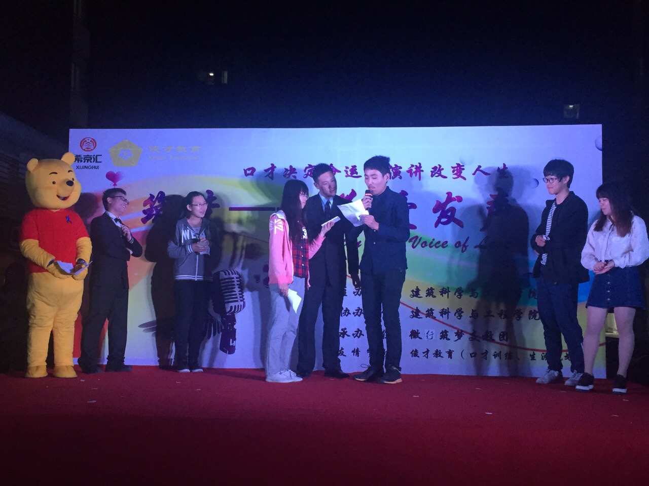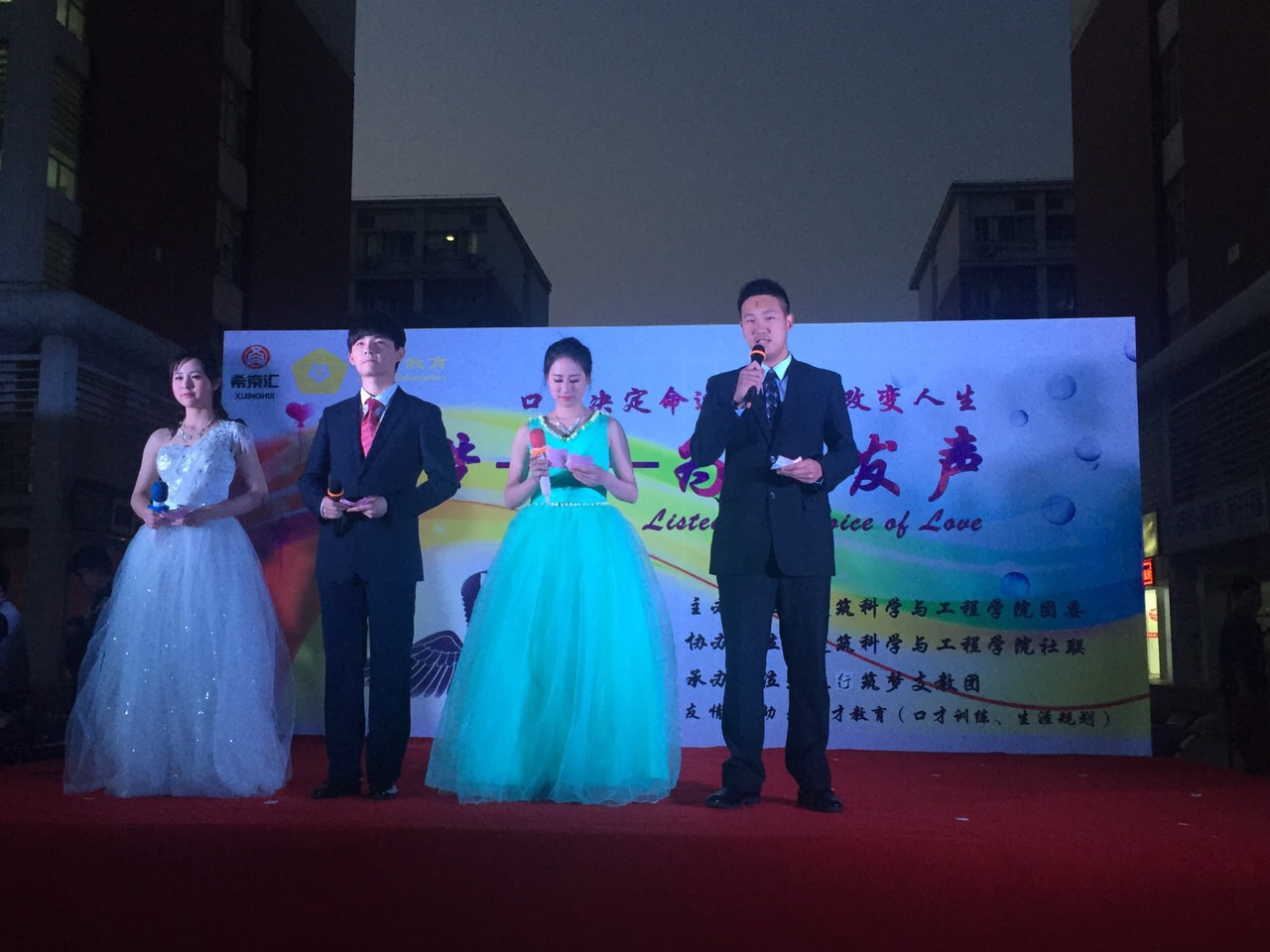 4月18日晚,由我院团委主办、微行筑梦支教团承办的“筑梦——微爱发声”义演晚会在扬子津西区食堂广场隆重举行。院实验中心副主任朱卫东老师,院团委副书记徐婷老师,院团委高福营老师、荣昆老师出席了本次晚会,晚会现场热闹非凡,吸引了大批过往同学驻足观看。