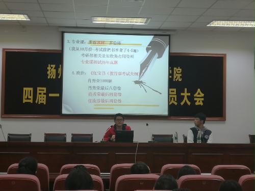 会上,2012级同学们结合自身的考研经历,围绕如何选取专业与院校、制定复习计划、调整心态等方面谈了自己的经验和感受。胡东康同学认为:“考研的成功等于正确的方法加之不懈的努力以及恰当的复习材料”。他风趣的语言、清晰的思路以及开门见山的风格,赢得了同学们阵阵热烈的掌声。谢珂同学则向大家着重介绍了他保研的经历;朱治文同学向大家强调了在备考过程中心态的重要性;杨盼盼同学从“真题”、“笔记”等具体问题着手,叮嘱同学们要仔细研究真题题型,揣测出题动机;朱剑文同学向大家具体阐述了他备战考研的计划,希望低年级同学可以尽早确立考研目标,早做准备。