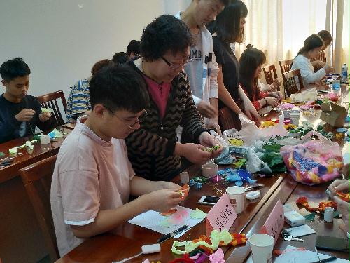 洪老师从去年下半年开始指导我院学生制作手工花,所以在活动开始之前,院团委会学生代表主动为洪老师送上了鲜花,并祝她母亲节快乐。活动开始后,各个小组成员精诚合作,在洪老师的指导下,同学们不断发现新的创意,做出了荷花,康乃馨等不同品种的手工花。最终,每个参赛小组都在规定的时间内完成了任务,评委们最终选出了表现较为突出的队伍,并进行了表彰。