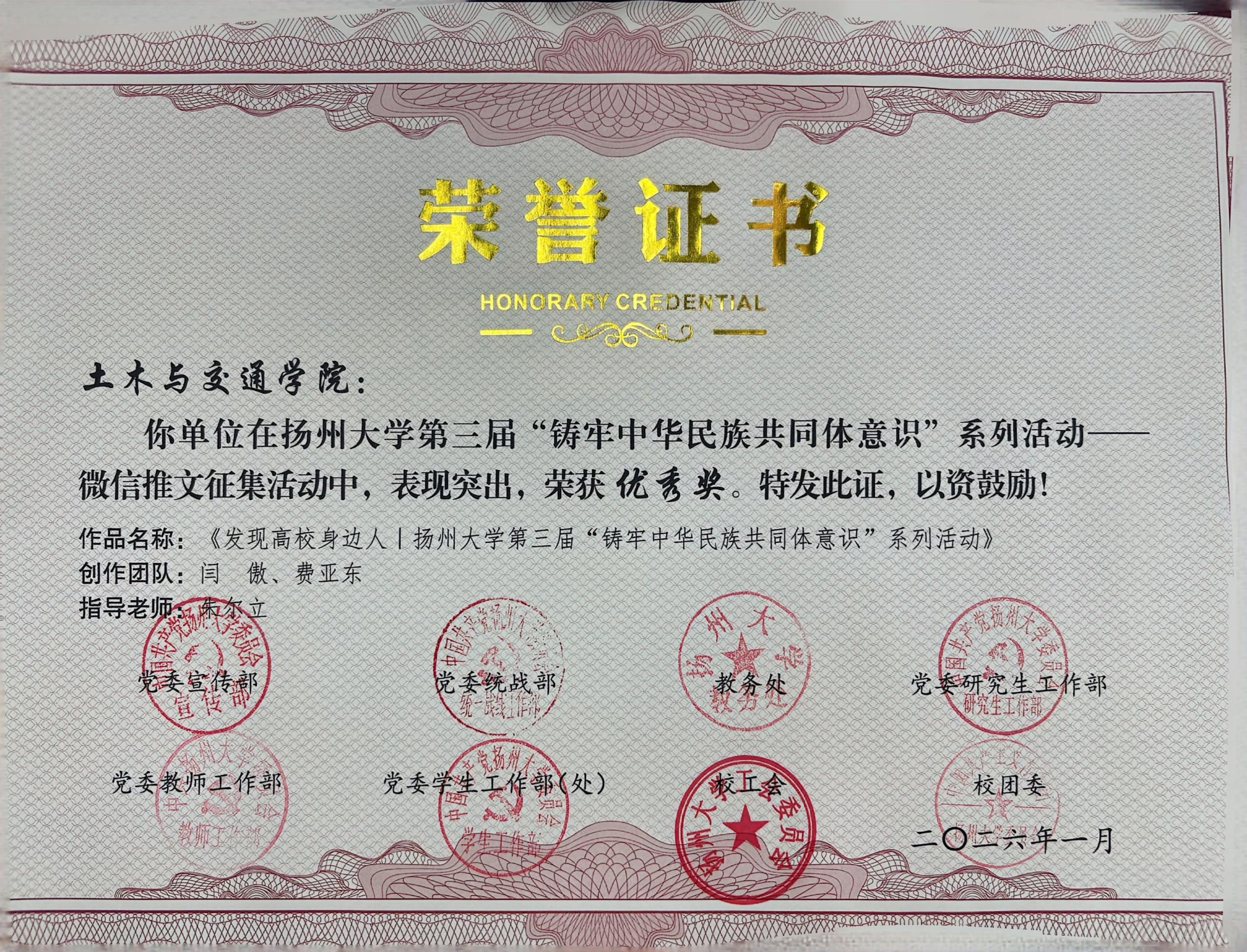 日前,扬州大学第三届"铸牢中华民族共同体意识"系列活动评选结果公布,土木与交通学院报送的作品《发现高校身边人|扬州大学第三届“铸牢中华民族共同体意识”系列活动》在微信推文征集活动中荣获优秀奖。