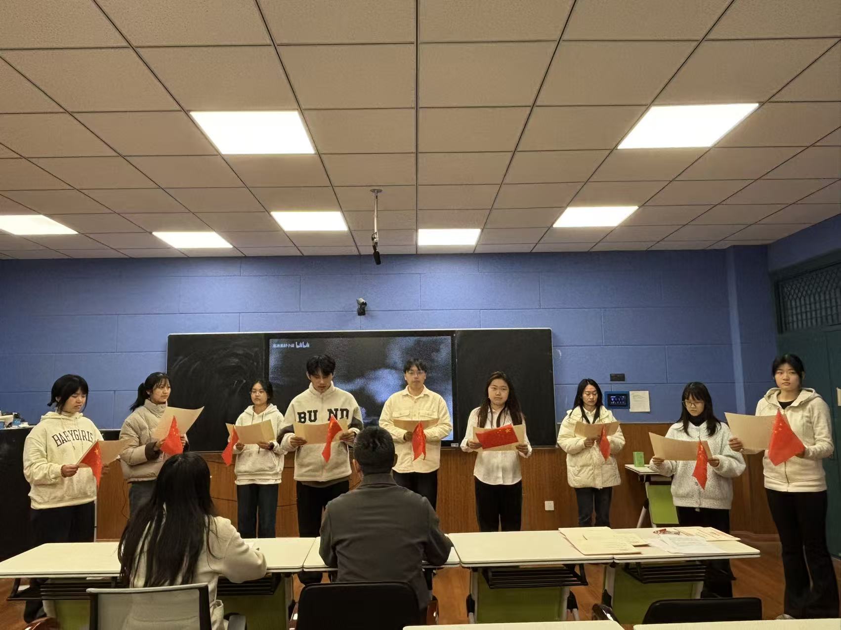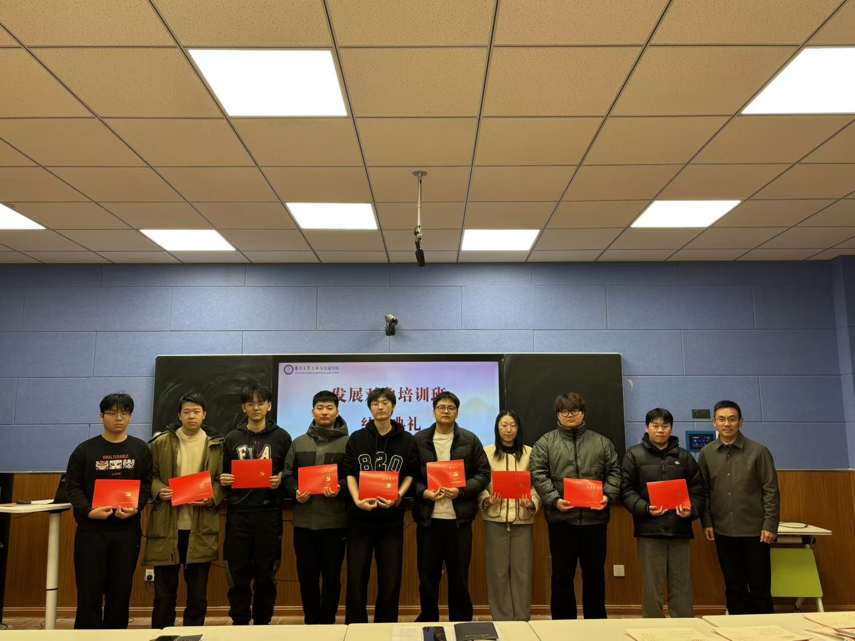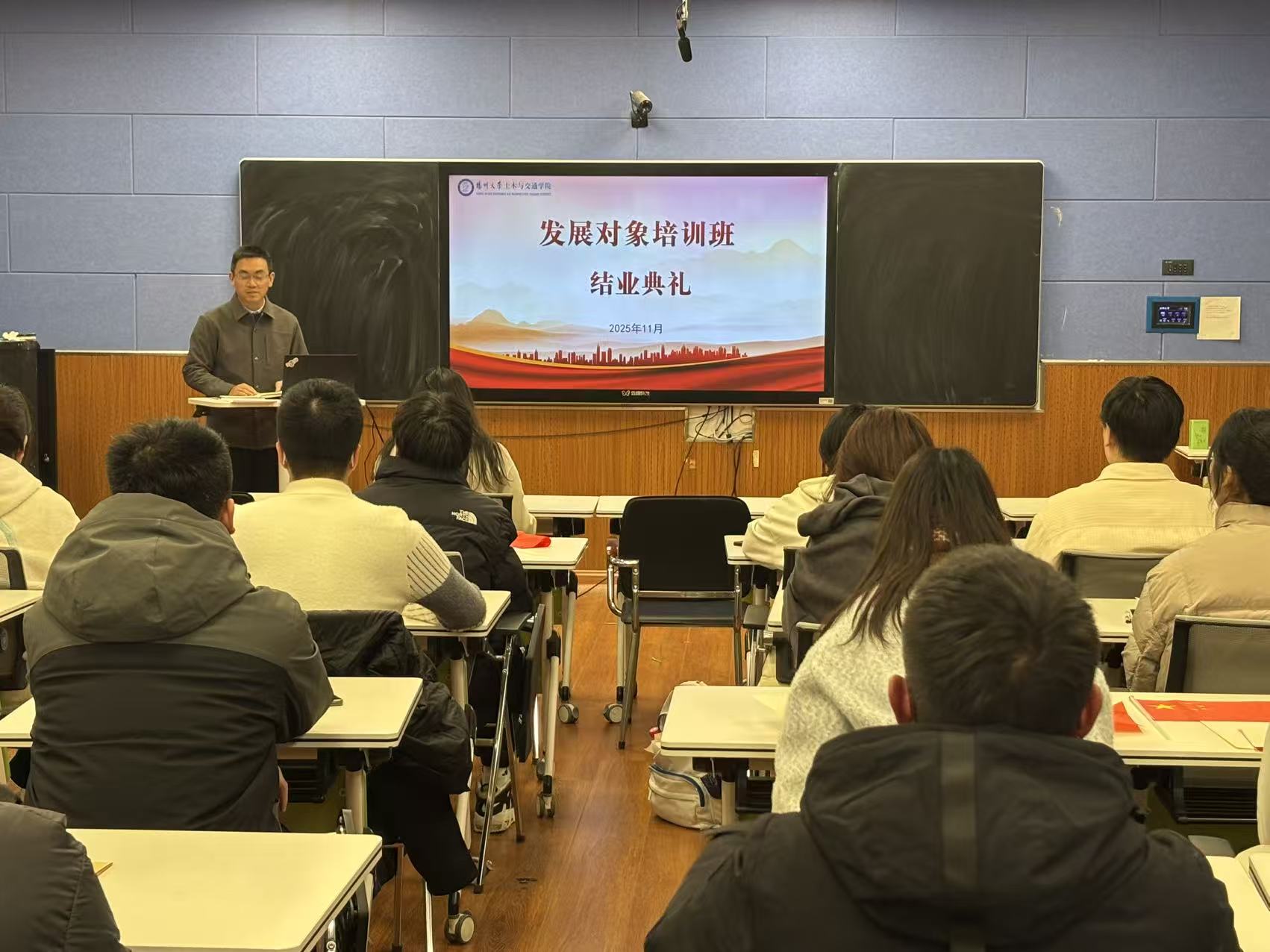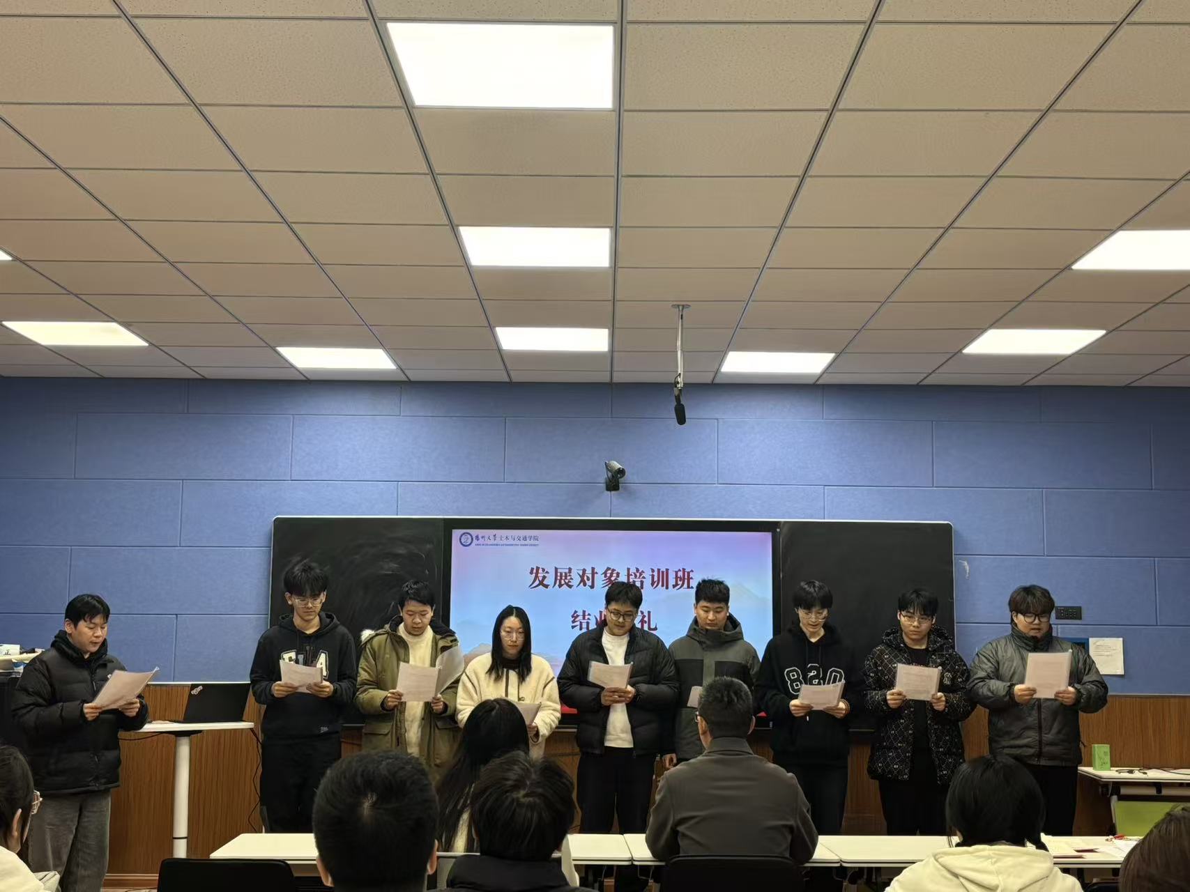 11月19日晚,学院分党校在实学楼408教室举行培训班结业典礼。各小组通过节目表演与感悟分享等形式,汇报学习成果、展示青春风采。《青春》和《青春中国》等诗朗诵,《没有共产党就没有新中国》等歌曲,饱含着对党和祖国的清澈的爱。院领导为全体学员颁发结业证书,为张允峰、董晨昊、刘志翔、魏亮、许舒翔、王苏皖、费子芸、杨嘉仪、冯煜晗、王优优、朱帅等11名学员颁发“优秀学员”证书。张彦在总结讲话中对学员们的成长进步给予充分肯定,寄语大家把组织上入党作为砥砺前行的澎湃动能,把思想上入党作为铭刻终身的不懈追求,将个人奋斗融入时代洪流,为推进中国式现代化贡献青春与智慧。