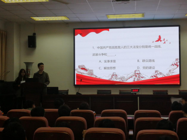 “中国共产党在民主革命中战胜敌人的三大法宝是什么?”“哪一事件从组织上确立了党对军队的绝对领导,为建立一支无产阶级领导下的新型人民军队奠定了基础?”……随着一个个问题的抛出,同学们紧张讨论,积极应答,比赛氛围十分热烈。大家在讨论中回顾党史,在答题中重温党章,通过党史知识问答见证了中国共产党的伟大历程,更加坚定了一心向党的理想与信念。