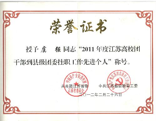 日前,共青团江苏省委、江苏省委教育工委授予院团委书记、学工办主任虞强同志为“2011年度江苏高校团干部到县级团委挂职工作先进个人”称号。同时,共青团河北沧州市委也授予虞强同志“优秀挂职团干部”称号。