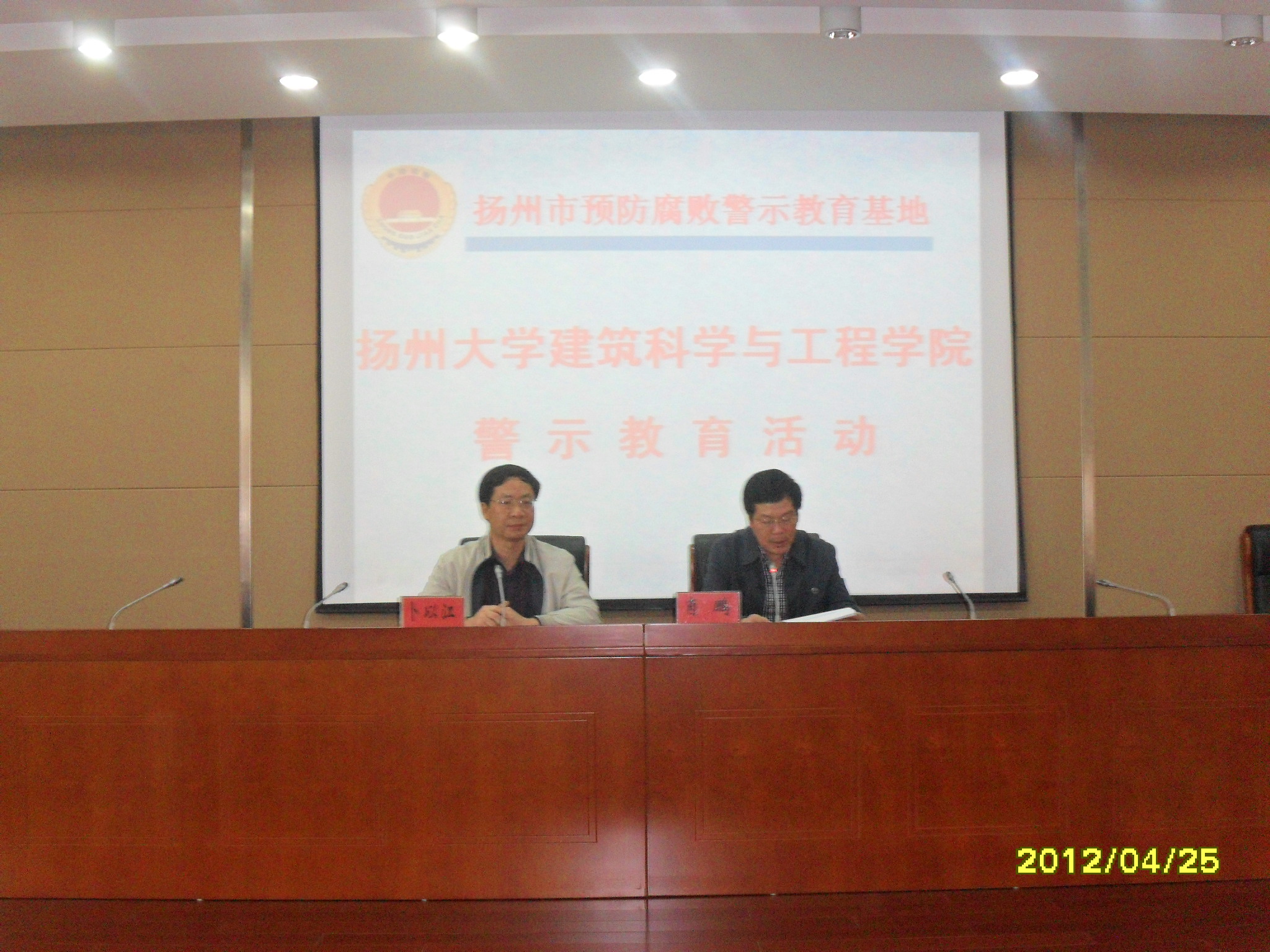 2012年4月25日下午,学院全体院领导、中层干部及在扬毕业生党员一行90余人来到扬州市警示教育基地参加警示教育活动,院党委卜以江书记主持了本次活动。师生一行参观了警示基地中的反腐倡廉图片展览,观看了反腐倡廉图片宣传片。毕业生党员在院党委余洪副书记的带领下,进行了廉洁承诺宣誓。最后,院长肖鹏教授就学院党风廉政建设为在场师生做了报告,他要求大家进一步认识高校加强党风廉政教育的重要意义,并以学院正在开展岗位廉洁教育工作为契机,切实加强我院的党风廉政建设。他同时提出要加快学院廉洁教育体系建设,开创有学院特色的党风廉政教育新局面。