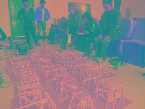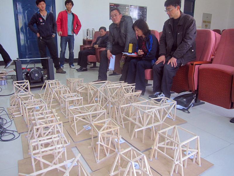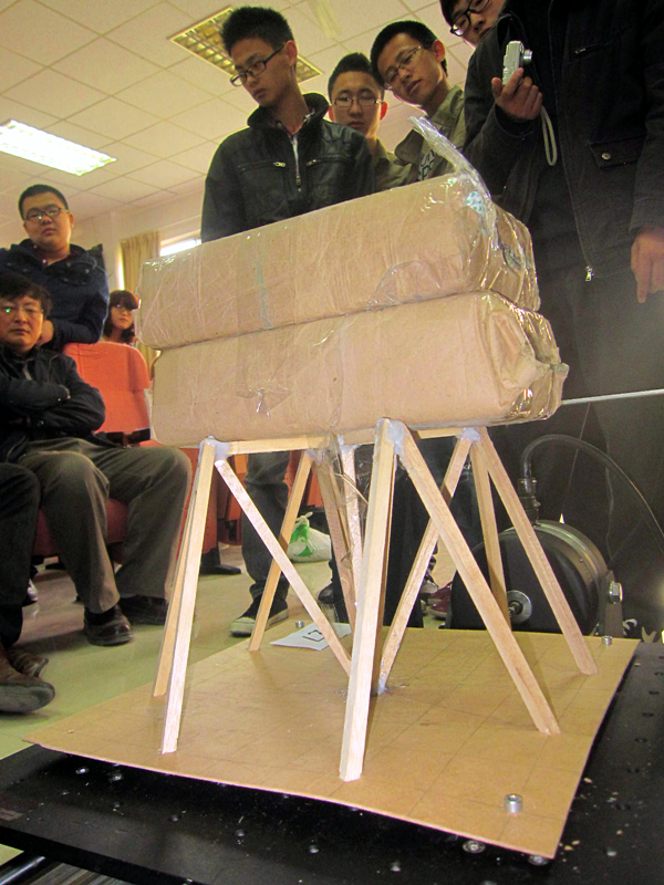 据活动组织者介绍,此次比赛就是要让建筑物在负重的情况下模拟地震发生时的稳定性,所有参赛组需在比赛前一天将一根根木条经过测量、切割、打磨,涂上粘合剂、拼接、晾干等程序制作成建筑模型,比赛当天将40公斤的重物放在模型上,并在震动台上以最大的振幅和频率进行5分钟的震动。比赛时只有几个模型被震得散架。土交班的薛栋杨组和阿斯嘎组在比赛结束后还主动申请进行加载60公斤的比赛,令人惊讶的是那两个看似弱不禁风的的“建筑”竟然岿然不动倒。