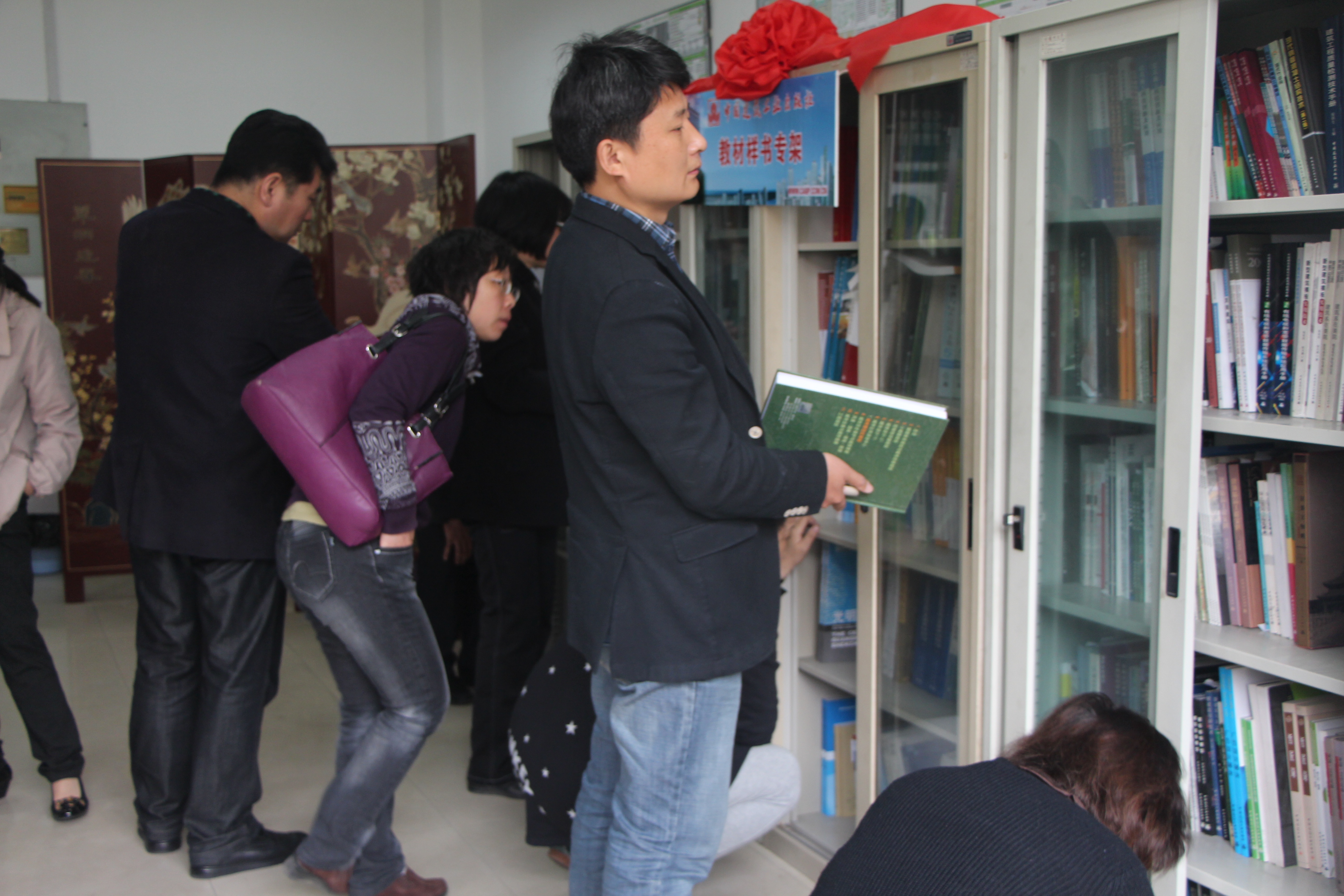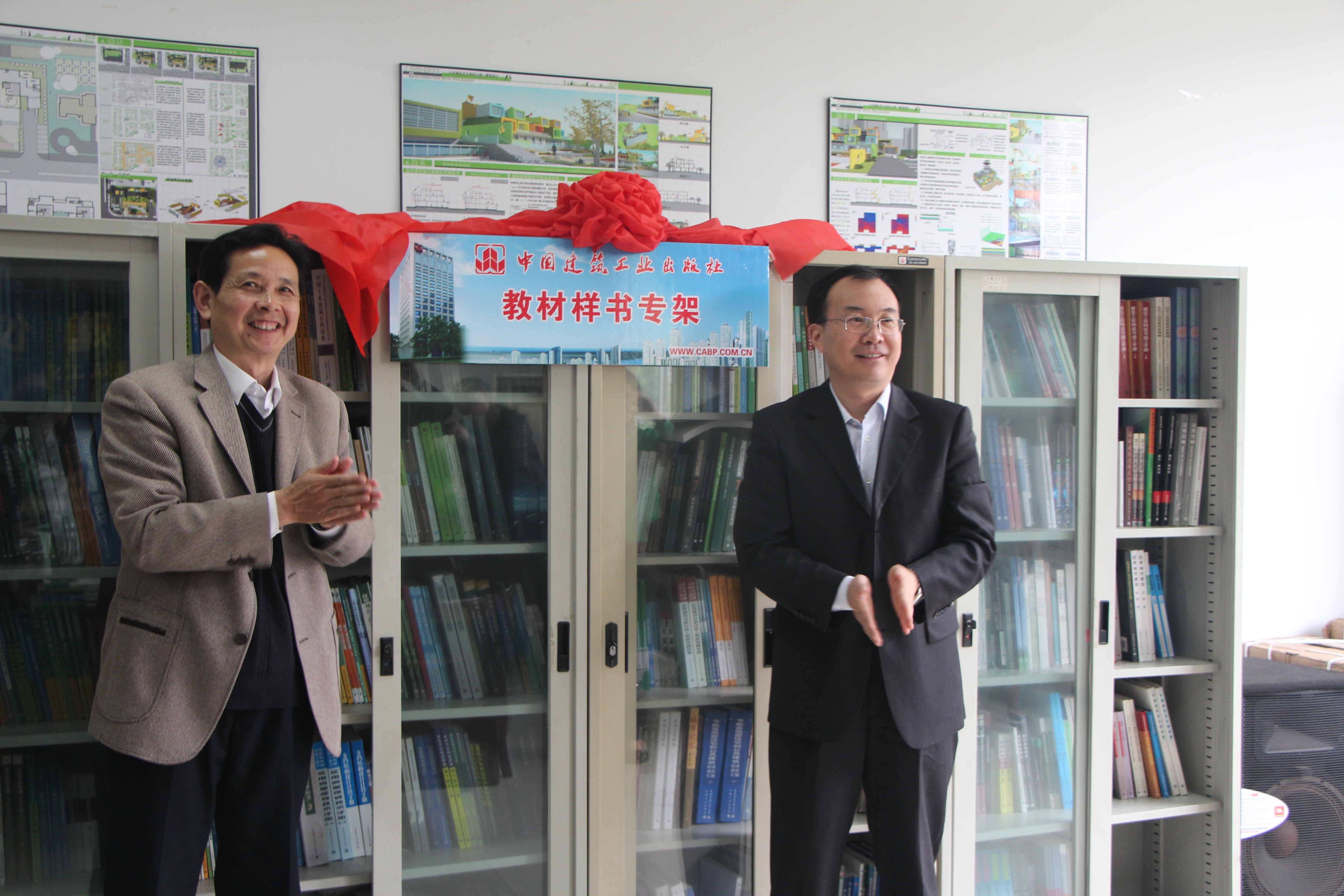 捐赠仪式上,沈社长表示,中国建筑工业出版社将在此次捐赠、设立建筑类教材专架(1300余册)的基础上,将于以后每年及时增补、替换最新出版的图书,以此来大力支持我校图书馆专业图书(电子书)建设。图书馆负责同志与沈社长共同为样书专架揭牌。