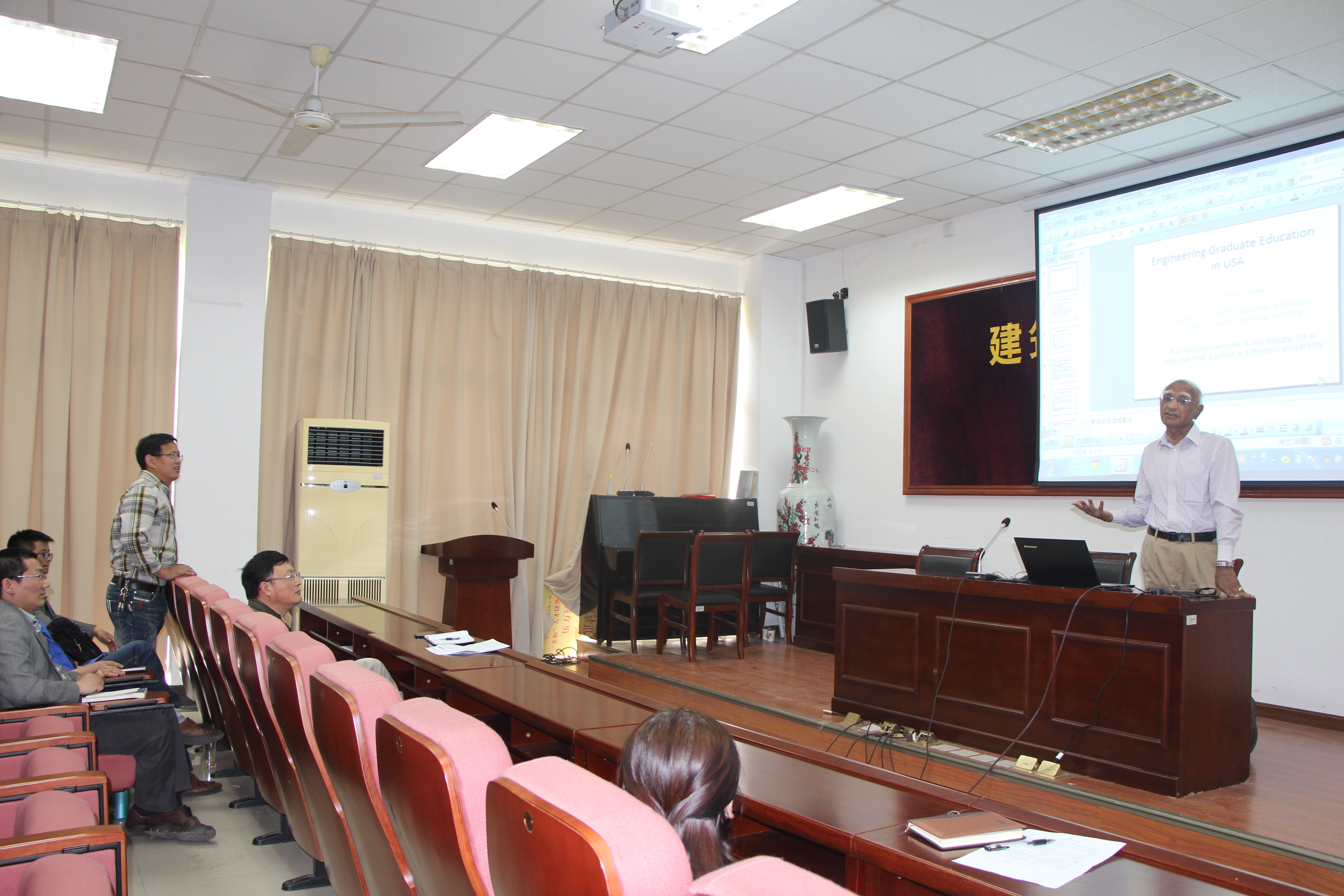 应我院李世荣教授邀请,美国弗吉尼亚理工大学Romesh C. Batra教授 于2014年5月4日至14日对扬州大学进行了访问和讲学。来访期间,Batra教授为我院研究生和中青年教师讲授了20学时的全英文有限云方法(The Finite Element Method)课程,并为全院师生作了题为Graduate Education in Engineering in USA的讲座。在访问期间,Batra教授还与土木工程系的青年教师和研究生进行了深入的交流,并与李世荣教授在功能梯度材料结构的力学行为方面就共同关心的问题进行了多次讨论和交流。