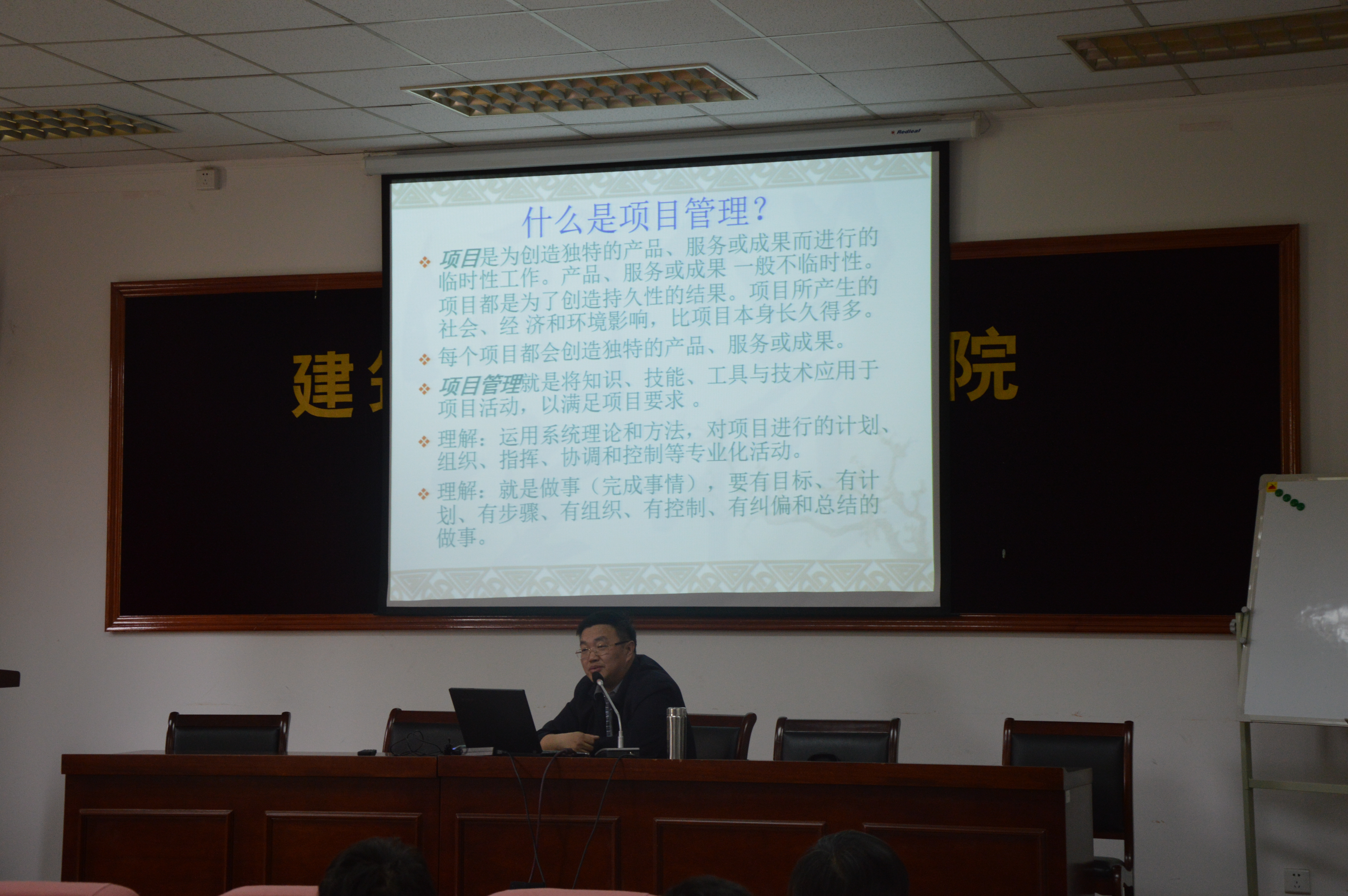 深圳京华置地江苏公司总经理叶枫以《项目管理在工程建设中的应用》为题,为同学们讲述了日常项目管理中的一些注意事项,他以自身经历告诉同学们“三管三控”在管理过程中的重要性,同时,他还赠送给同学们一些他工作多年来的思考碎片,勉励大家勤思考、多沟通。