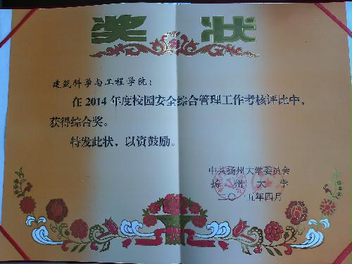 近日,学校召开2015年校园安全综合管理工作会议。校长焦新安,市委政法委常务副书记、综治办主任陈博文出席会议并讲话。校党委副书记、纪委书记刘延庆主持会议。副校长洪涛总结部署校园安全综合管理工作。会议上,我院被表彰为2014年度校园安全综合管理先进集体,荣获年度管工作综合奖,院党委书记卜以江代表做学院交流发言。
