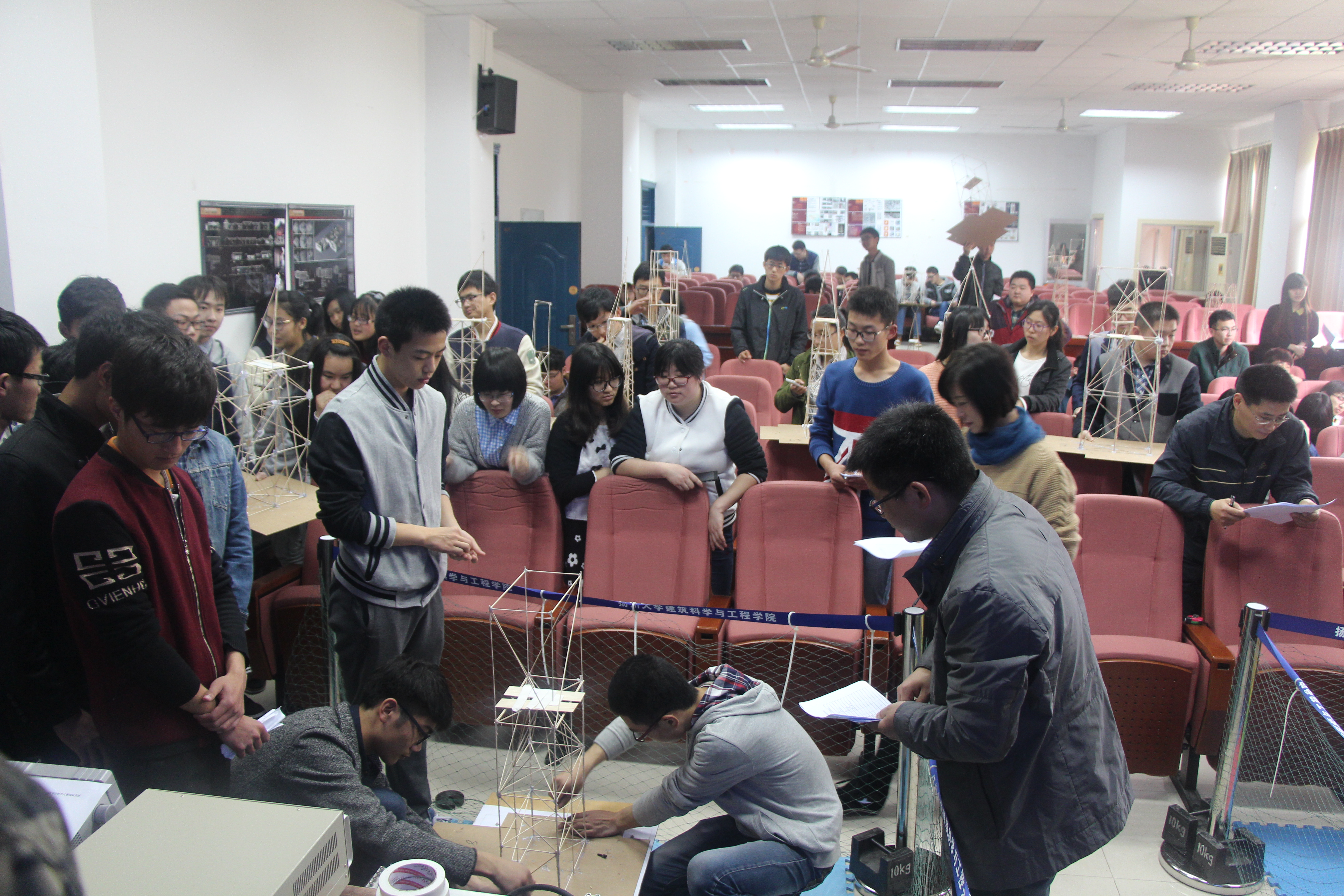 据悉,本次比赛共分为三个阶段,第一阶段为4月7日到4月13日,各参赛小组需设计出各自的模型方案,然后找专业老师(力学与结构方向的老师)对他们的方案进行审核并提出修改意见。第二阶段为4月15日到4月17日,各参赛小组按照各自设计的方案完成结构模型制作,制作模型至少需要八小时。第三阶段,各小组成员需要在4月18日上午将制作的模型带往学院1号楼进行加载抗震试验。最后,经过激烈的竞争,土建1302班戴闯、田世龙小组以及土建1301班黄佳赟小组以优异的成绩获得大二组一等奖,土建1201班薛演初、王长江小组获得大三大四组一等奖。