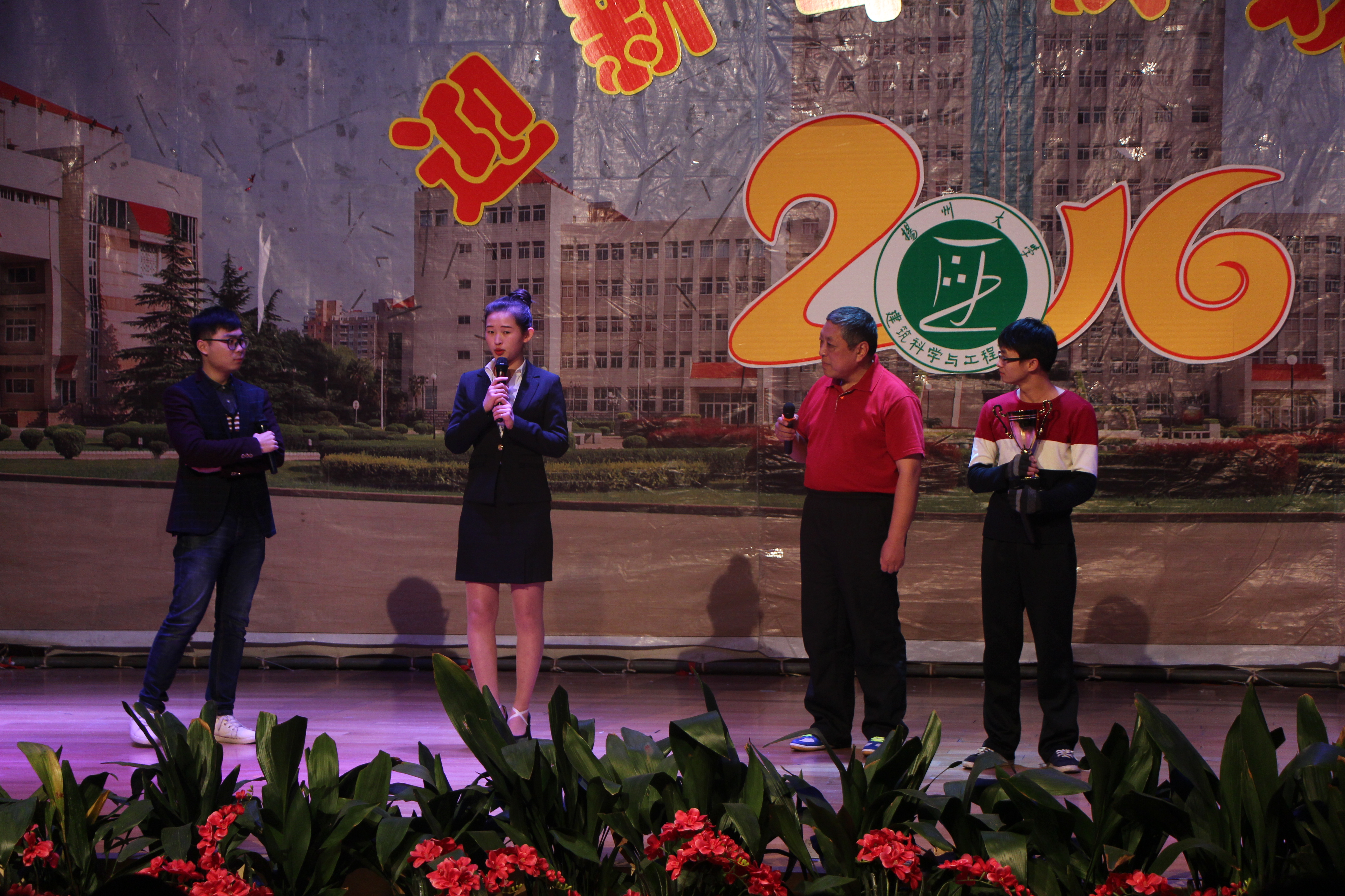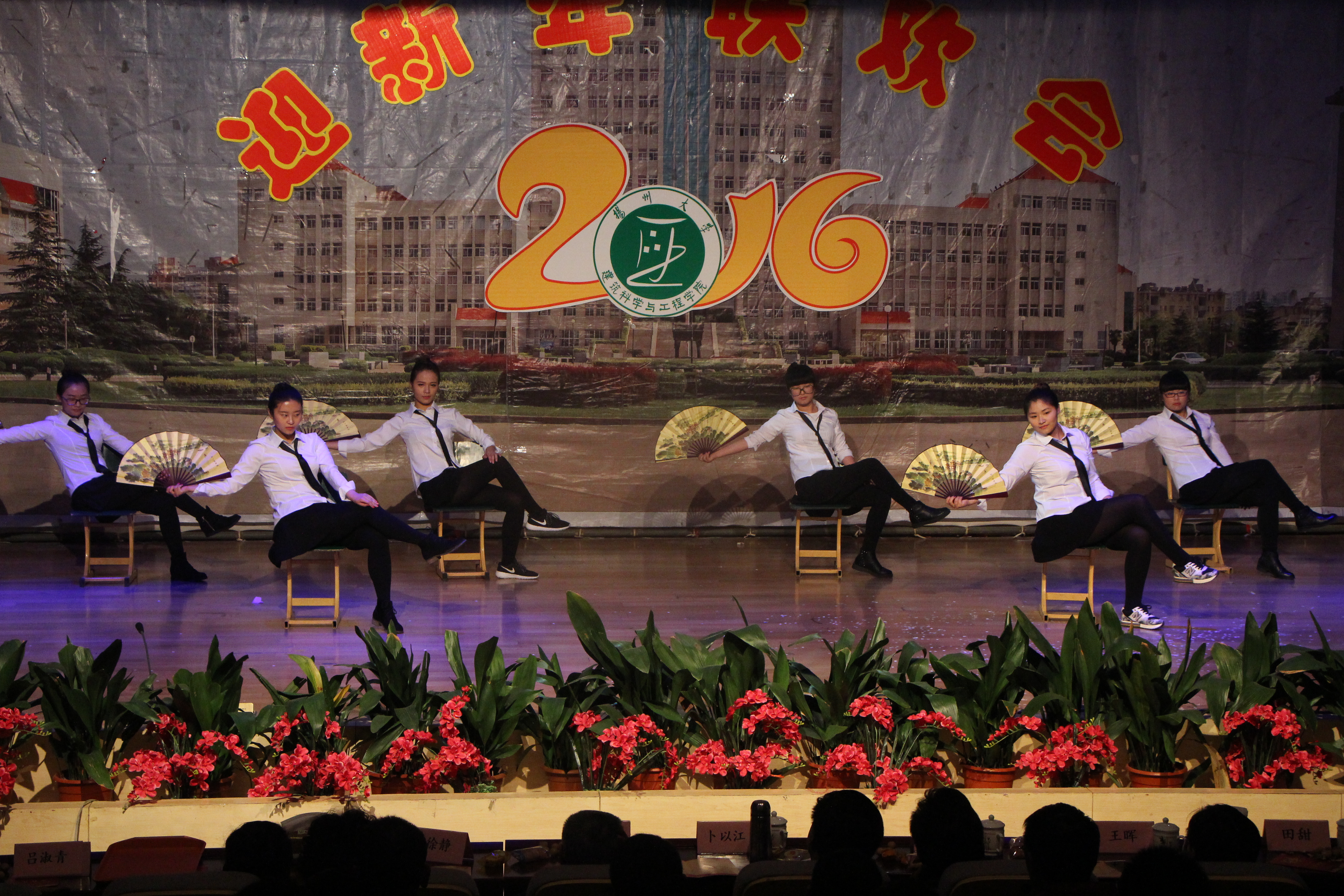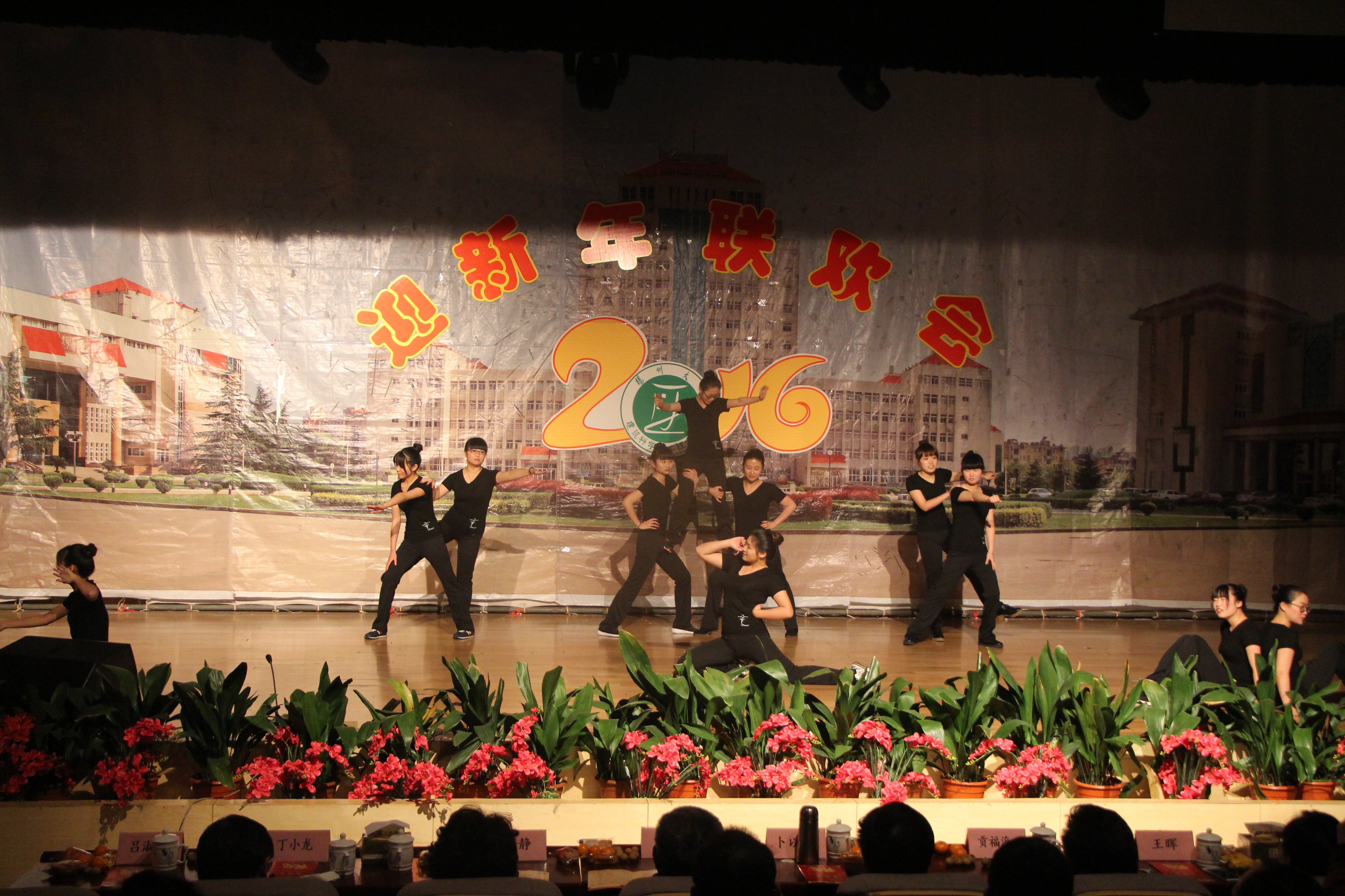 悦动舞蹈队的开场舞《青春飞扬》瞬间点燃了全场的气氛,充满活力的舞步引得全场叫好声一片。魔术《伞扇奇缘》、小品《李氏麻辣汤圆》、话剧《甄嬛后传》、扇子舞《青花瓷》、电吉他独奏《卡农》等一系列节目精彩纷呈,均以其独特的表演方式赢得观众阵阵掌声和欢呼声。沈新元、吕淑青、朱小军、张兵、宋拓、李波、宋兴禹等老师带来的各类精彩节目更是将晚会的气氛推向高潮。伴随着全体学生会同学的合唱《相亲相爱的一家人》,整场晚会落下帷幕。