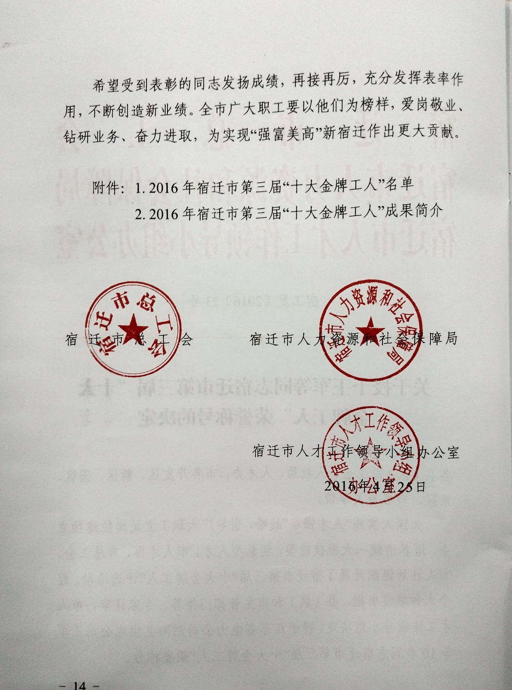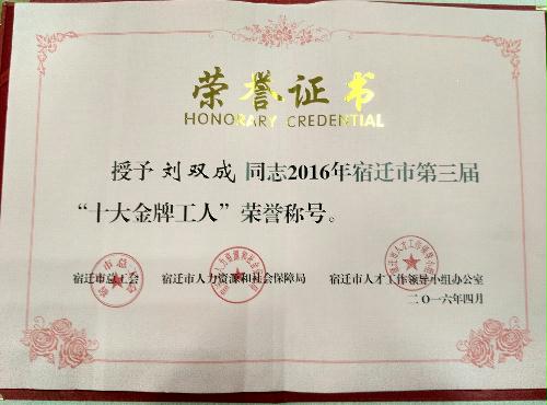 刘双成同学就职于宿迁交通工程建设有限公司,现为我院继续教育2014级土木工程专业学生。该同学长期从事沥青摊铺机操作工作,工作中坚持学习,善于创新,多次参与国家、省、市级重点工程建设。今年“五一”期间,刘双成同学荣获宿迁市第三届“十大金牌工人”称号。我院得知这一喜讯后,号召全体继续教育学生要以他为榜样,勤奋学习、爱岗敬业、钻研业务、奋力进取,在平凡的岗位上作出不平凡的贡献。
