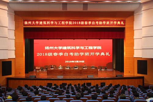 3月28日下午,我院于扬子津校区文体馆三楼小剧场成功召开了2018级春季自考助学班开学典礼。院党委书记顾建国、副院长李胜才、扬州工业职业技术学院建筑工程学院党政领导、教师代表以及2018级春季自考助学班新生两百余人出席典礼,典礼由继续教育办公室主任徐婷主持。