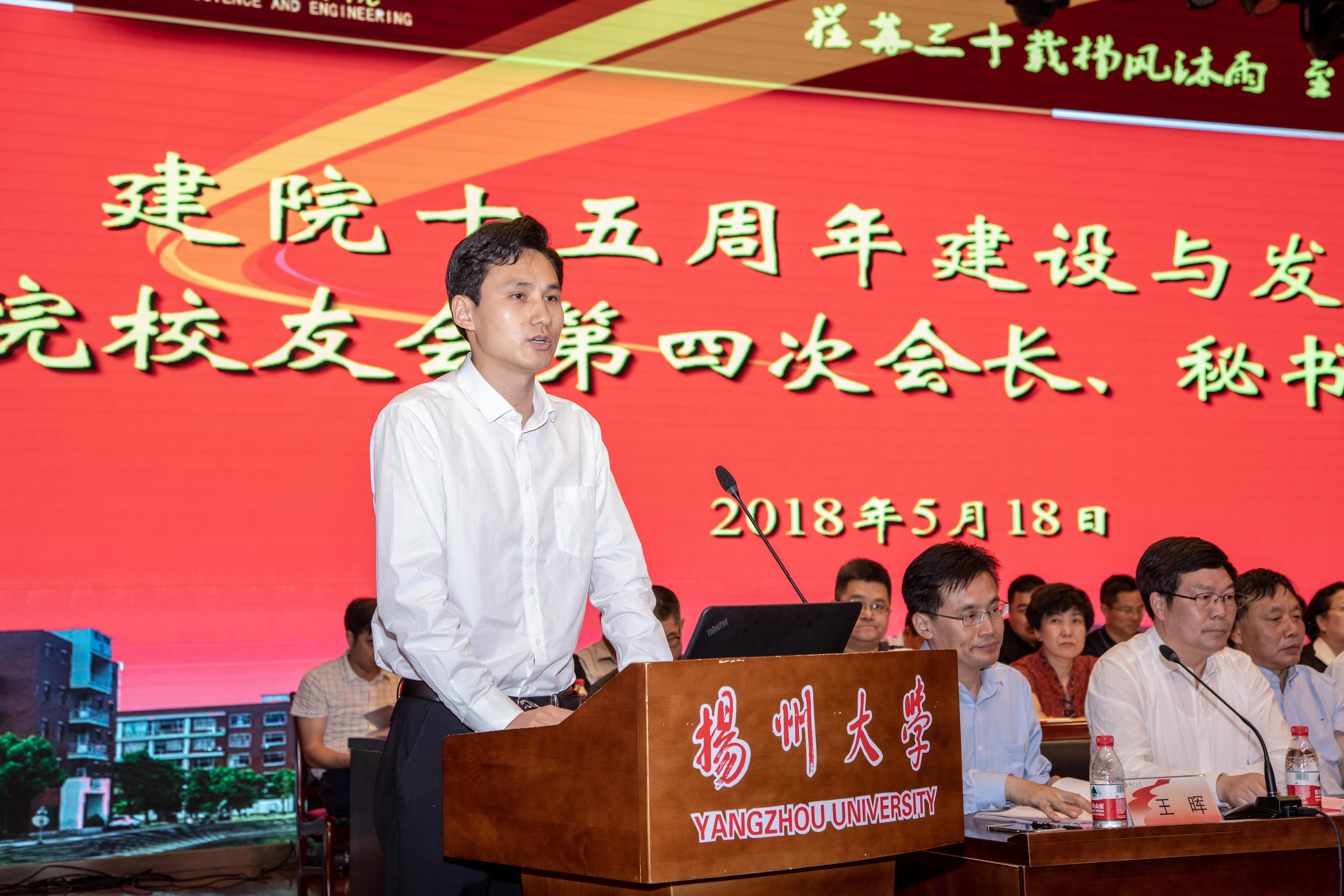 会议在庄严的国歌声中拉开帷幕。建工学院院长、院校友会会长肖鹏做了学院工作报告,总结了学院迁址新校区办学以来所取得的成果,提出了学院今后的工作思路和发展规划。院党委副书记、院校友会副会长兼秘书长王晖做了院校友工作报告,回顾和总结了学院近几年来的工作,明确了学院今后一个阶段的整体发展思路、奋斗目标和主要任务。江苏扬建集团有限公司总经理邹厚存、院工程管理系副主任张兵、寇长江同学、单晨晨同学分别作为校友代表、教师代表、研究生代表和本科生代表发言。