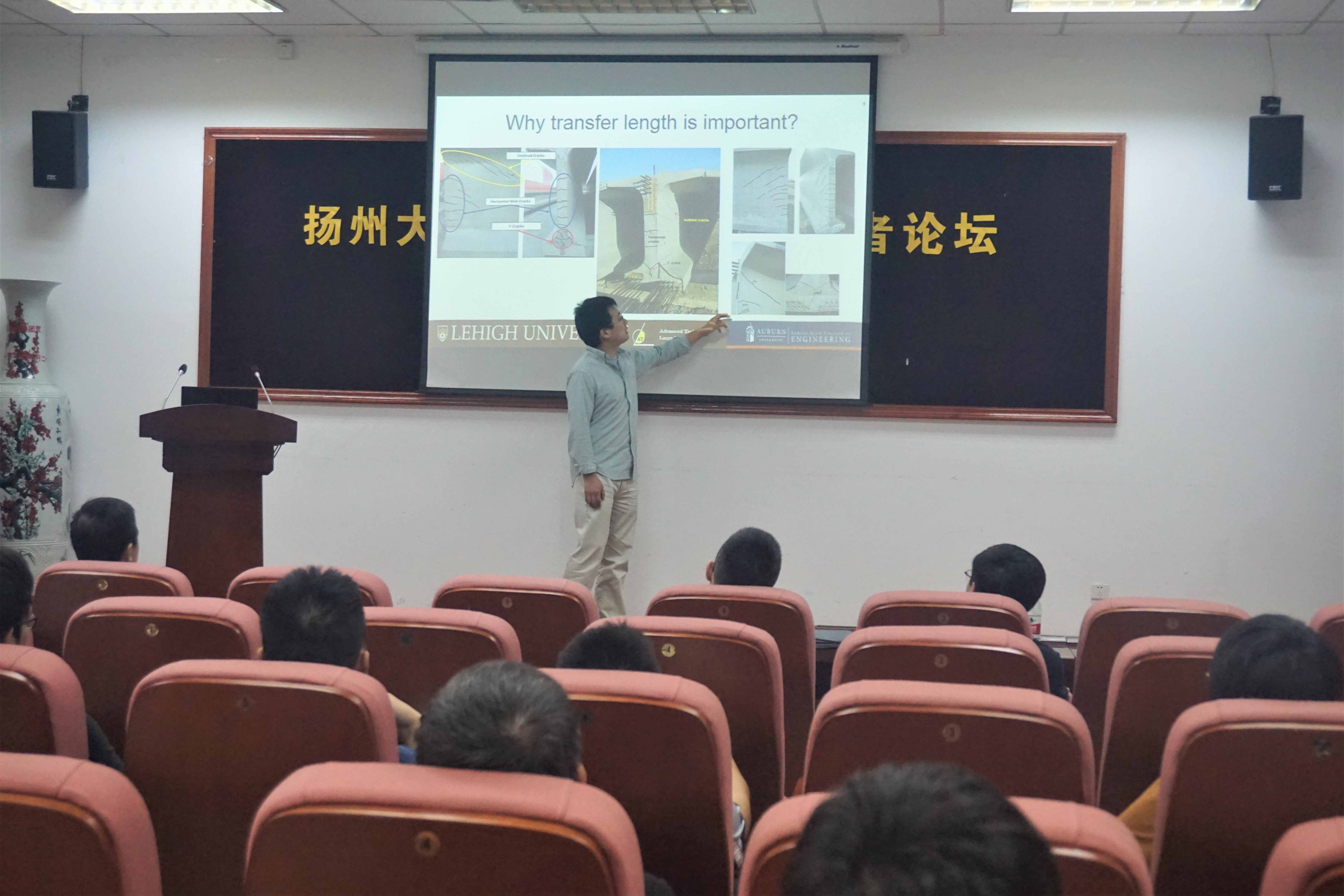 5月30日下午,扬州大学2018国际青年学者论坛建工学院分论坛在我院S1-102报告厅举办。此次论坛共有3位青年学者讲学。丹麦奥尔堡大学助理教授刘明哲博士主讲了《建筑节能与建筑能源供给灵活性》;美国里海大学博士后研究员白峰涛博士主讲了《Composite beam theory,blast and impact》;东南大学仲英学者、香江学者,博士生导师李志斌教授主讲了《高速公路智能化控制技术中关键问题研究》。