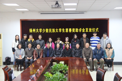 12月27日,扬州大学少数民族大学生慈善奖学金发放仪式在我院S1-202会议室隆重举行。参加本次仪式的有扬州市慈善总会常务副秘书长潘勤女士,副秘书长金晏女士,扬州大学党委学工部副部长、学生处副处长王华,扬州大学关工委常务副主任叶蕴珊,院党委副书记王晖,扬州大学关工委办公室主任刘方云,扬州大学离退休处党工委书记、扬州大学关工委委员杨春燕老师,扬州大学工会办公室副主任李年春,扬州大学内派教师王敏奇老师、赛娜瓦尔·苏里坦老师,相关学院辅导员以及部分少数民族学生代表等。仪式由我院王晖副书记主持。