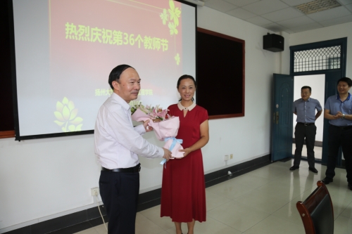 9月10日上午,焦新安校长亲临我院为获评扬州大学“2020年本科教学金讲台奖”的陶阳老师颁发荣誉证书,并祝学院全体教职工教师节快乐。