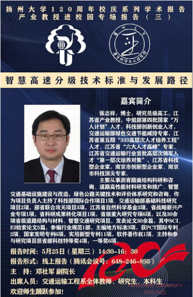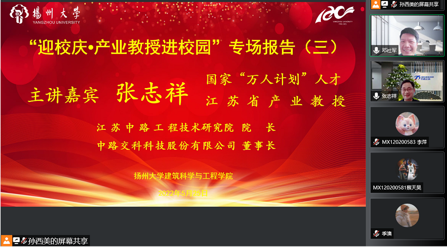 为庆祝扬州大学120周年校庆,进一步加强我院,激发创新热情,营造良好的学术氛围。5月25日下午,我院在线上举办了“迎校庆•产业教授进校园”专场报告活动(三)。特邀江苏中路工程技术研究院院长,中路交科科技股份有限公司董事长张志祥教授,为我院师生作题为《智慧高速分级技术标准与发展路径》的学术报告,报告会由建工学院副院长邓社军教授主持,近300名师生在线上参加了本次活动。