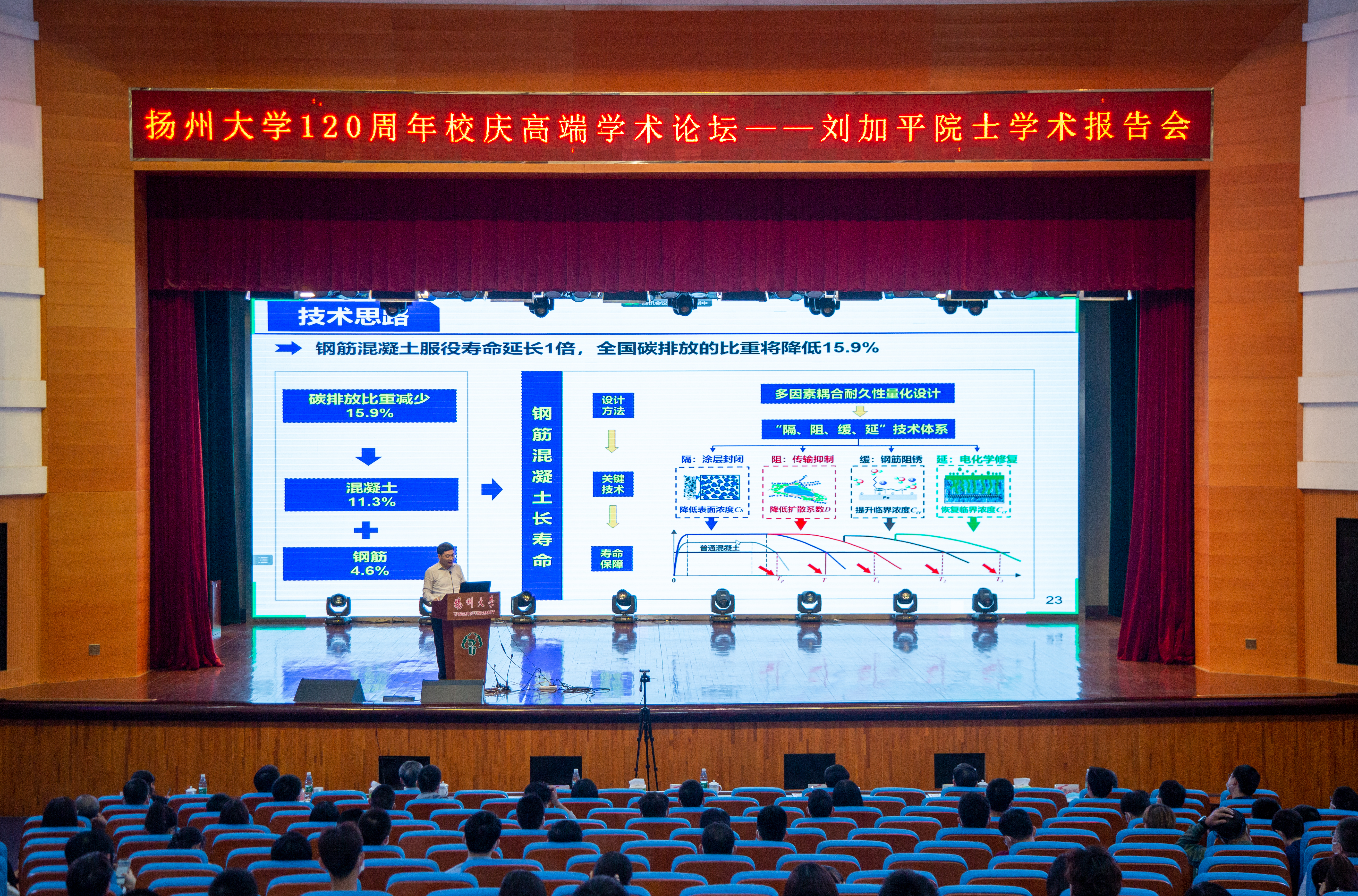 5月31日下午,中国工程院院士、东南大学首席教授、土木工程材料专家刘加平教授应邀走进扬州大学“庆祝建校120周年高端学术论坛”,为我校师生做了题为“低碳混凝土技术路径”的专题报告,校长丁建宁教授致欢迎辞,建筑科学与工程学院院长康爱红教授主持报告会。