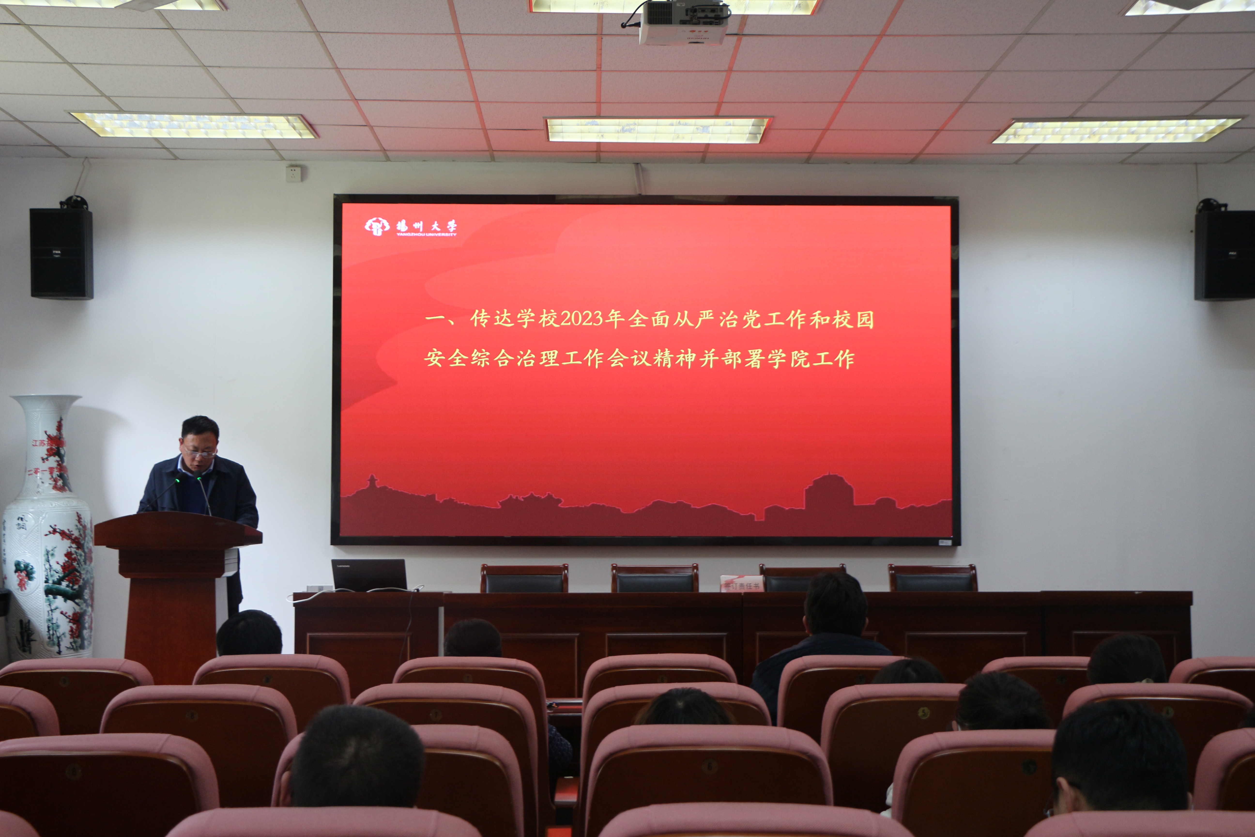 党委书记王恩军指出,一要提高政治站位,不断增强责任感和使命感。全院党员干部要把全面贯彻落实党的二十大精神作为首要政治任务,自觉用习近平新时代中国特色社会主义思想武装头脑、指导实践、推动工作。将履职担责体现到办学治院的各领域各方面各环节,以全面从严治党纵深推进引领保障学院事业高质量发展。二要准确把握形势,切实强化各项工作的针对性。要以问题为导向作为各项工作的切入点,深入查摆精准聚焦“四风”;强化意识形态领域的分析研判、风险排查和应对处置,加强意识形态阵地和队伍建设;高度重视师德师风建设,加强教师思想政治教育,引导教师坚守纪律规范“底线”,坚持教书育人“标线”,追求道德修养“高线”。时刻绷紧安全思想之“弦”,多种方式开展各类安全教育;细化安全生产责任清单,压实主体责任,常态化进行安全隐患排查,贯彻落实学校关于当前疫情防控的决策部署,确保各项工作有序开展。