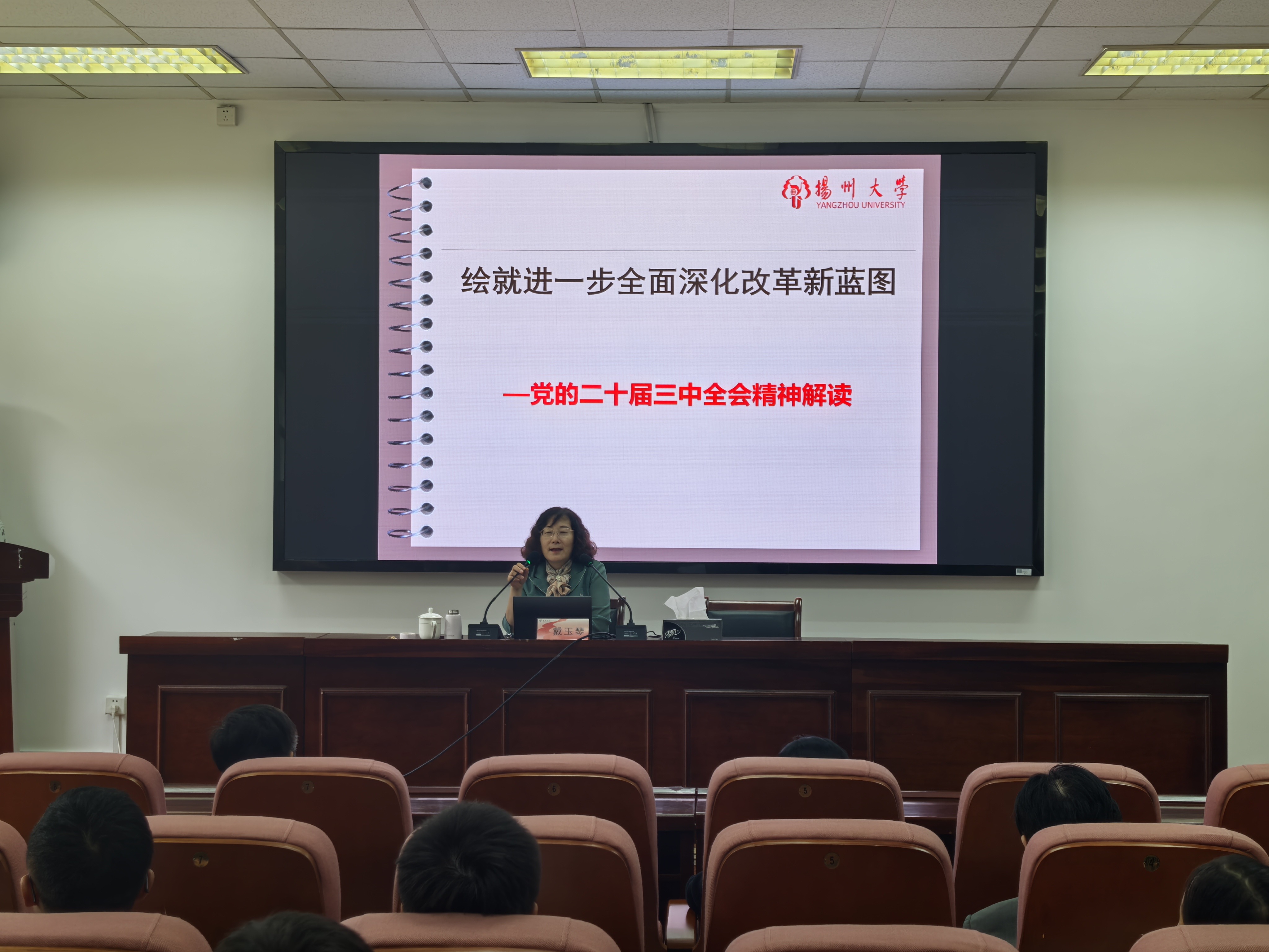 为全面深入学习贯彻党的二十届三中全会精神,引导全体师生准确把握全会精神的丰富内涵,切实把思想和行动统一到党中央决策部署上来,大力营造昂扬向上、团结奋进的浓厚氛围。我院于10月16日下午邀请扬州市委宣讲团成员、校学科办公室主任、马克思主义学院教授戴玉琴为全体教职工做党的二十届三中全会精神专题辅导报告会。