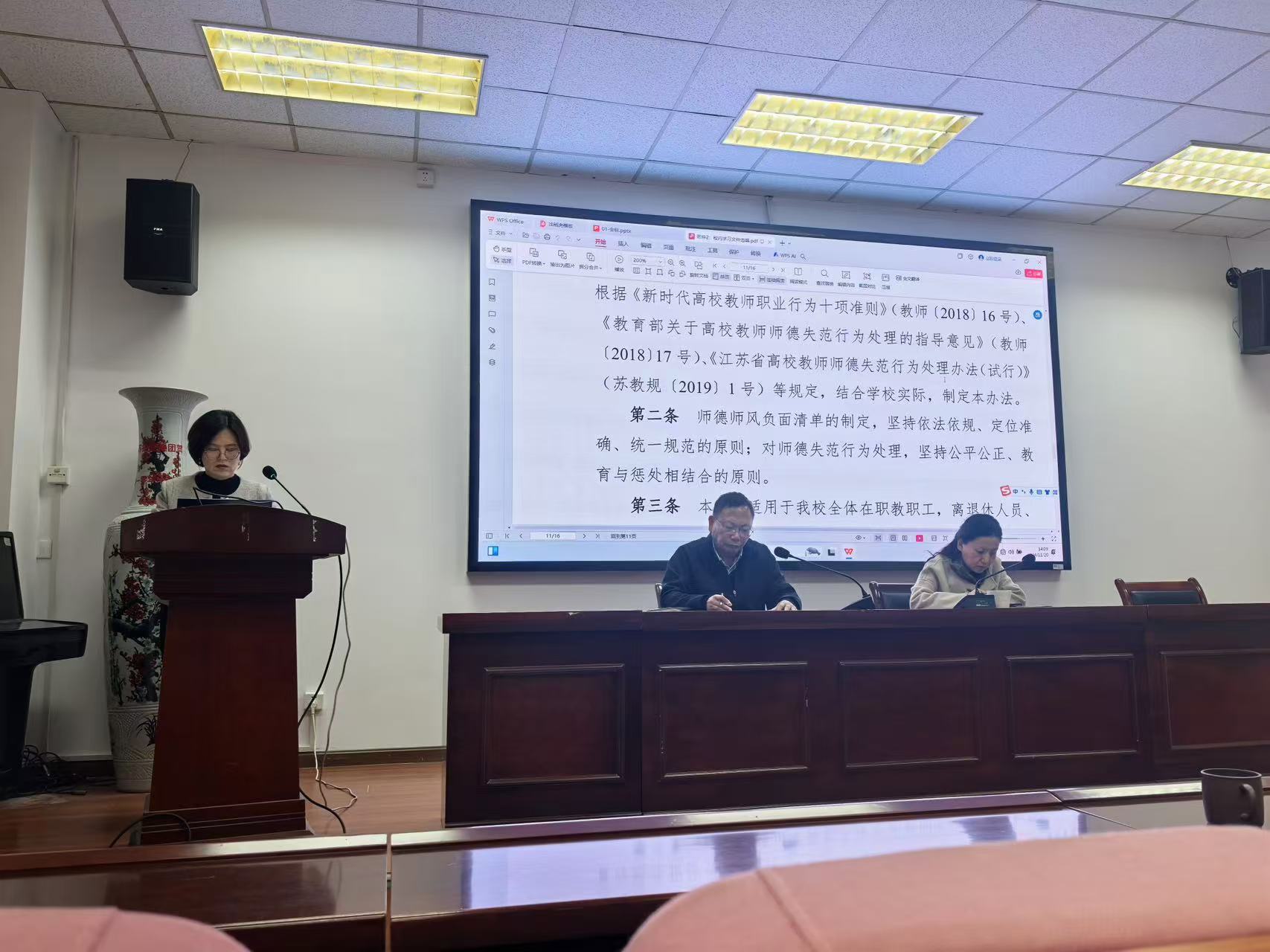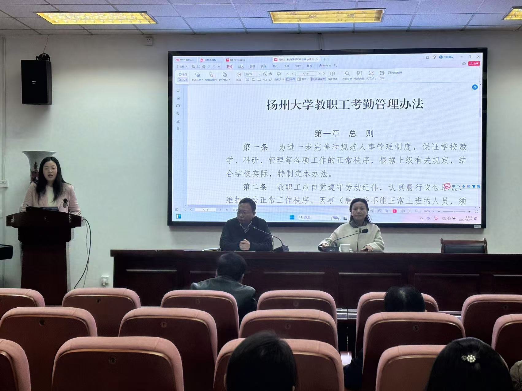为进一步强化规矩意识,规范管理流程,加强法律法规、制度普及和执行力度,保障各项工作规范化运行,11月20日下午学院在102报告厅举办教职工集中学习教育会,集中学习《扬州大学教职工考勤管理办法》和《扬州大学师德失范行为负面清单及处理办法》。