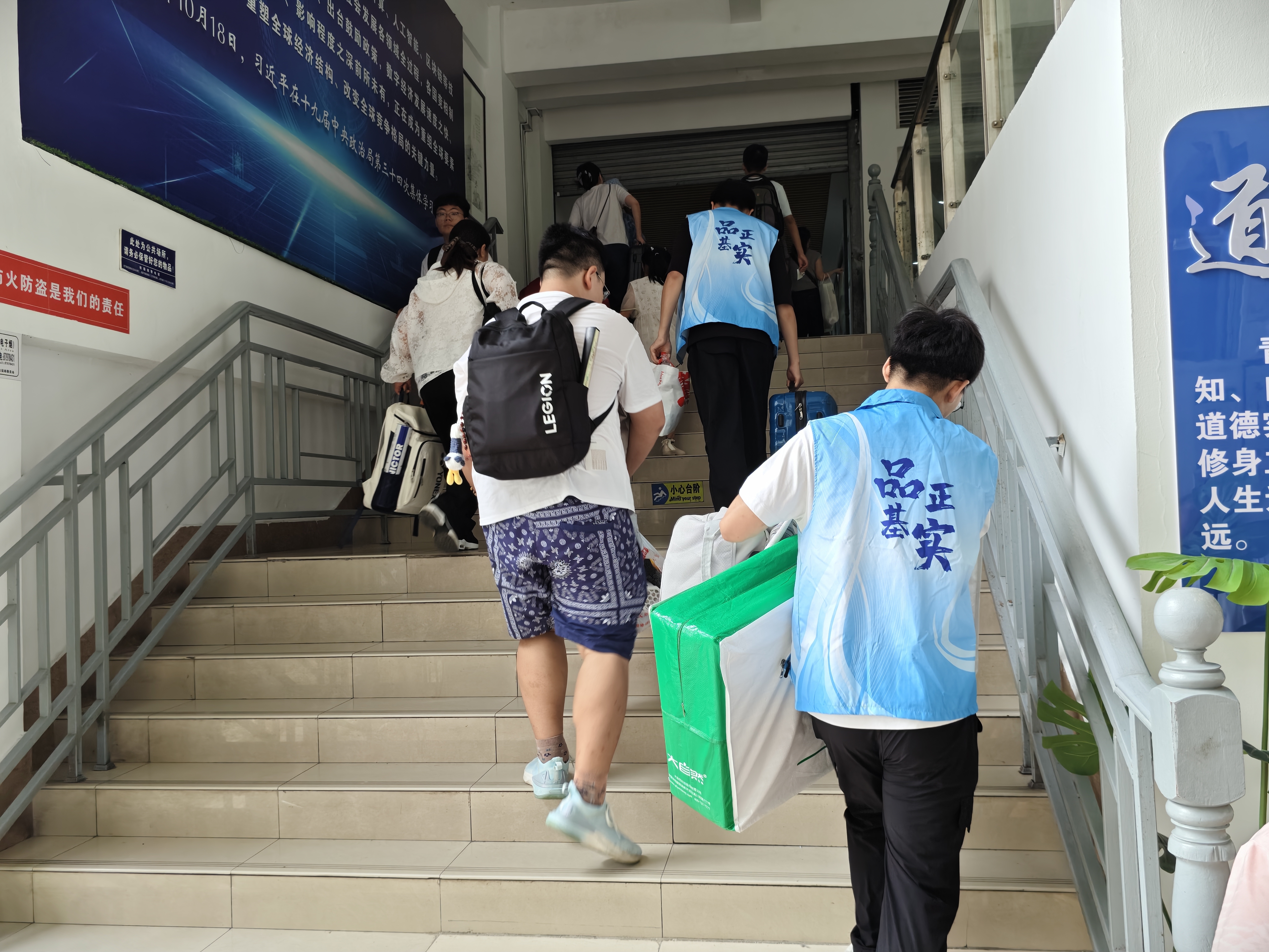 本次迎新工作中,学院共选拔67名学生志愿者,他们身着统一蓝色马甲,分布在报到点、宿舍楼、接驳车服务点等岗位,提供引导、咨询、行李搬运、防诈宣传等全方位服务,成为迎新当天一道动人的风景线。