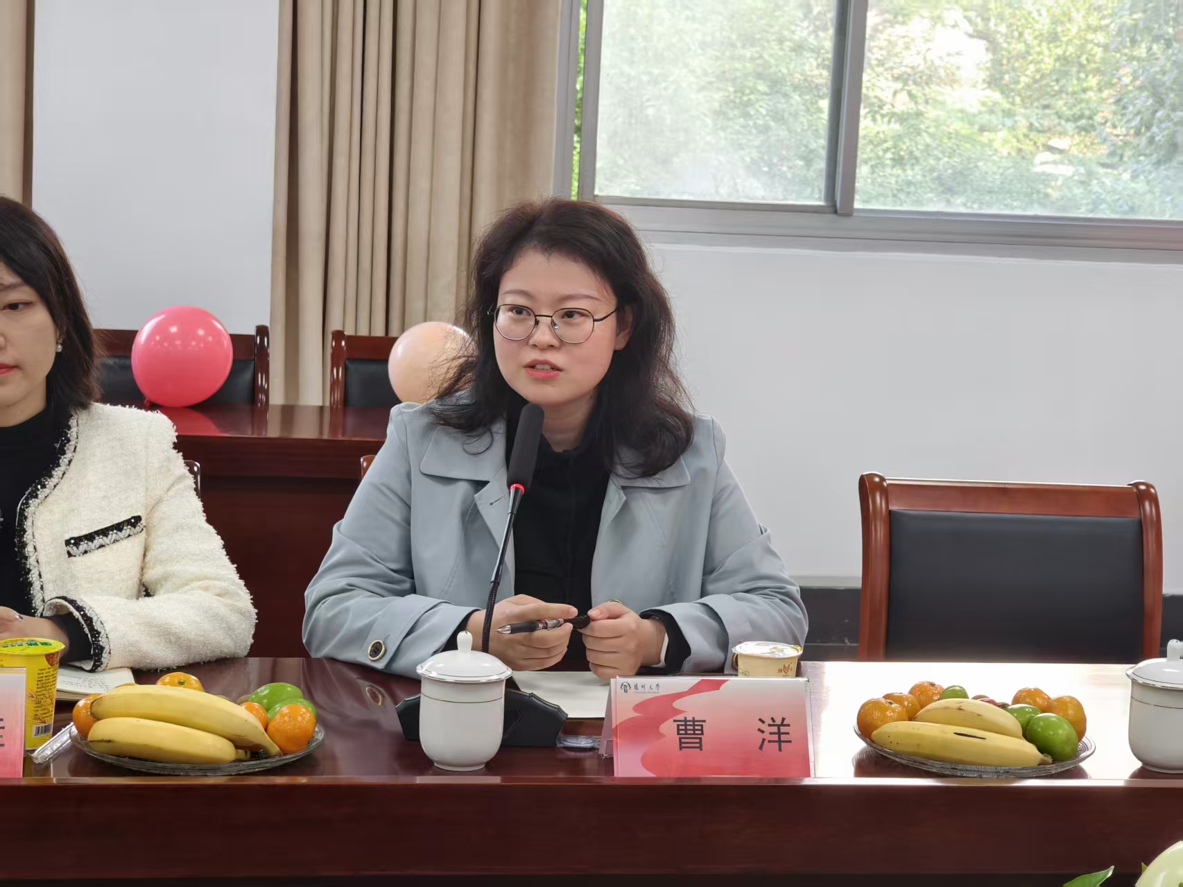 与会老师向校友赠送校友徽章。