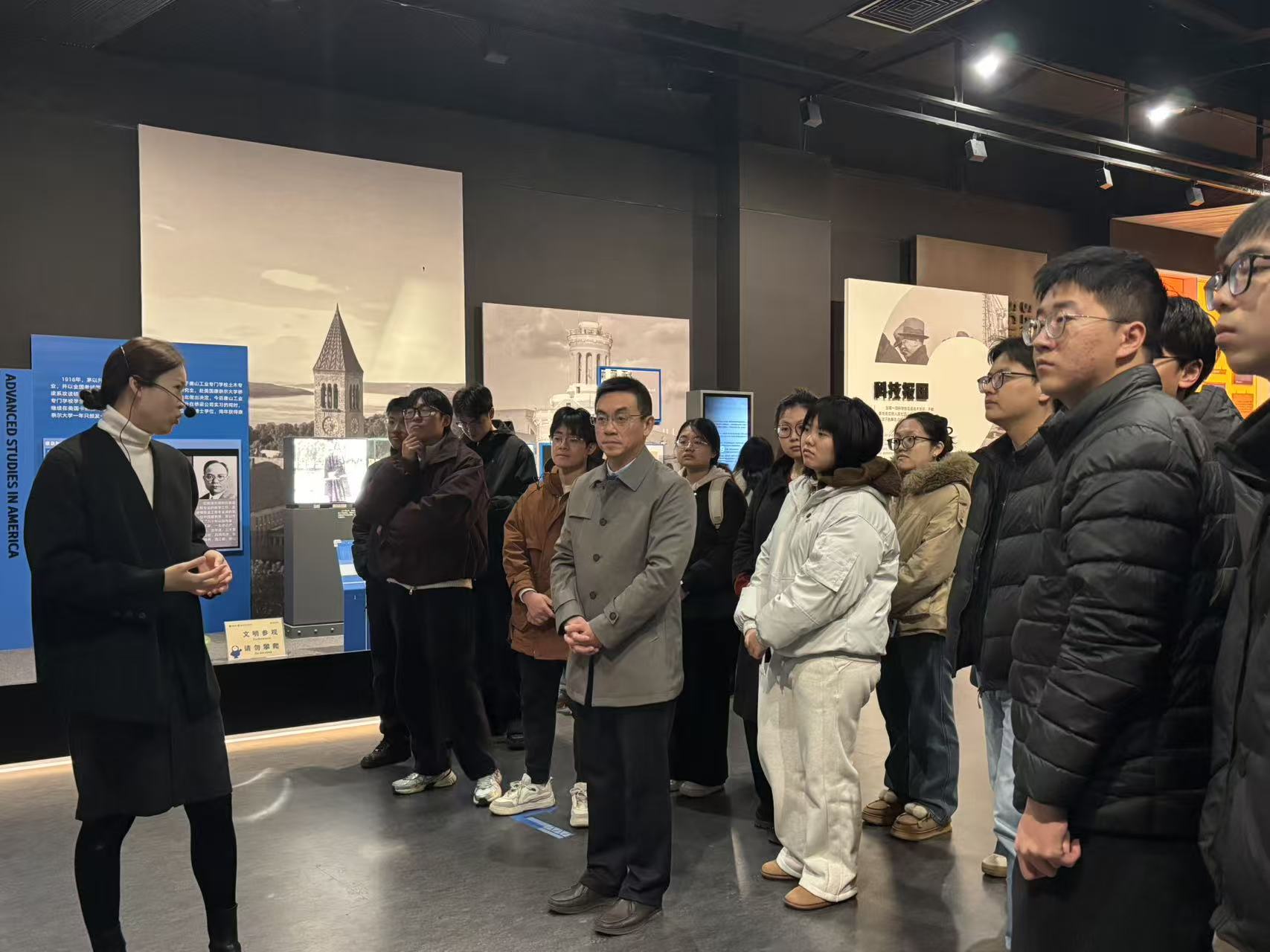 纪念馆内,同学们跟随讲解员先后步入“求学追梦”“科技报国”“教育科普”“情系祖国”四大主题展区,从茅以升学生时代总分第一的成绩单,到钱塘江大桥的设计图纸与实物史料,再到晚年光荣加入中国共产党的申请书,深刻感悟茅以升爱国、科学、奋斗、奉献的人生境界。