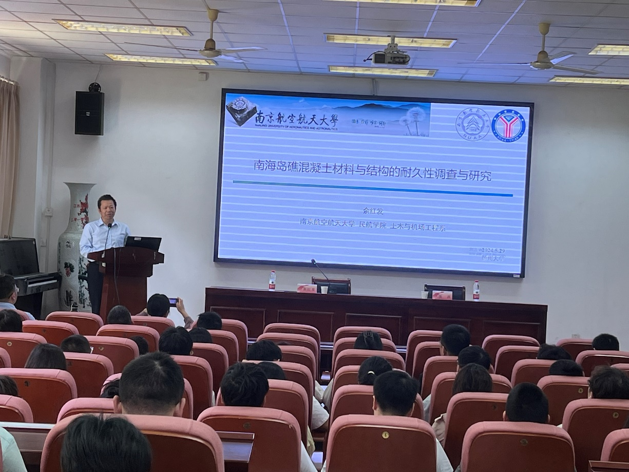 5月29日下午,南京航空航天大学余红发教授在建筑科学与工程学院102报告厅为学院师生做了一场题为“南海岛礁混凝土结构的耐久性调查与研究”的学术报告。此次活动由张兵副院长主持,学院土木工程专业的教师和研究生参加报告会。