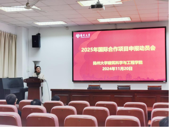 11月20日下午,我院在102报告厅召开2025年国际合作项目申报动员会,邓社军副院长主持会议,扬州大学海外教育学院院长周桂生教授、校科学技术处袁锐老师、全体院领导、系支部书记、系主任、各系科研主任、全体教授、各科技创新团队负责人及成员、实验中心主任、拟申报2025年各类国际合作项目的老师等出席了会议。