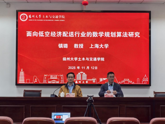 2025年11月12日下午,上海大学镇璐教授应邀为我院师生带来题为《面向低空经济配送行业的数学规划算法研究》的学术报告,并进行2026年度国家自然科学基金选题指导,分别由张彦书记和张兵副院长主持,土木工程系、智慧交通系、建筑学、工程管理系的教师和学生代表参加了本次活动。