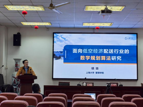随后,镇教授系统介绍了团队在卡车—无人机最后一公里配送、无人车—无人机按需配送等方面的重要研究成果。他从典型运作模式、数学规划模型构建、算法设计思路,到企业试点案例验证,进行了深入浅出的讲解,使与会师生对低空经济在城市物流体系中的应用有了更加全面的理解。