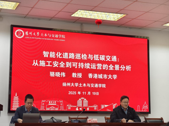 2025年11月19日,香港城市大学骆晓伟教授莅临我院作《智能化道路巡检与低碳交通:从施工安全到可持续运营的全景分析》学术报告。报告会由张兵副院长主持,土木工程系、智慧交通系、建筑系和工管管理系师生代表共同聆听了报告。